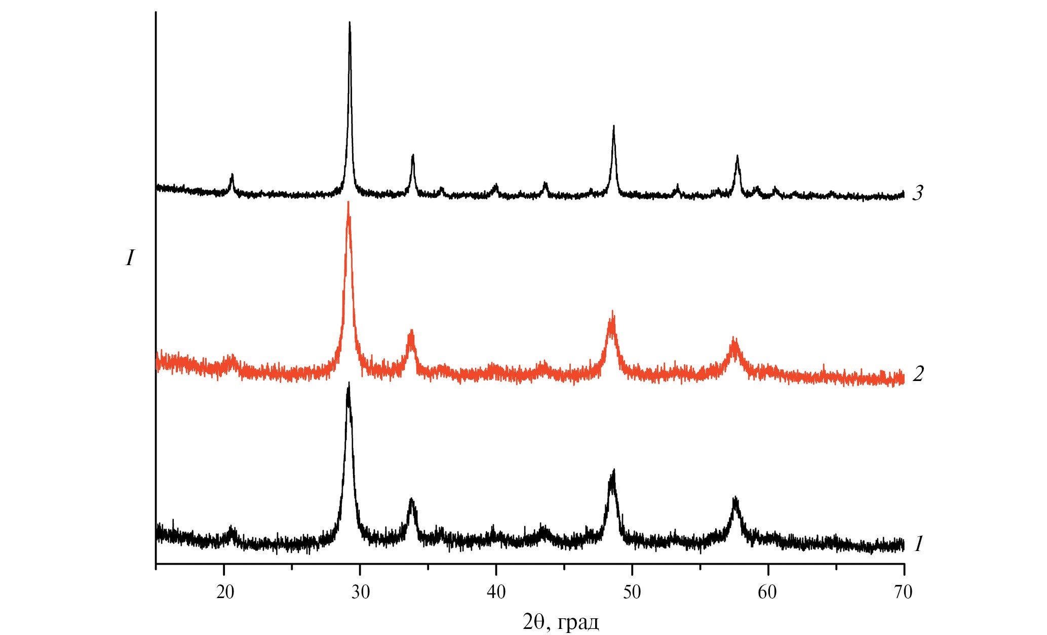 Рис. 4. Дифракционные картины препаратов Y2O3, полученных при отжиге комплексов III (1), I (2), II (3) на воздухе.
