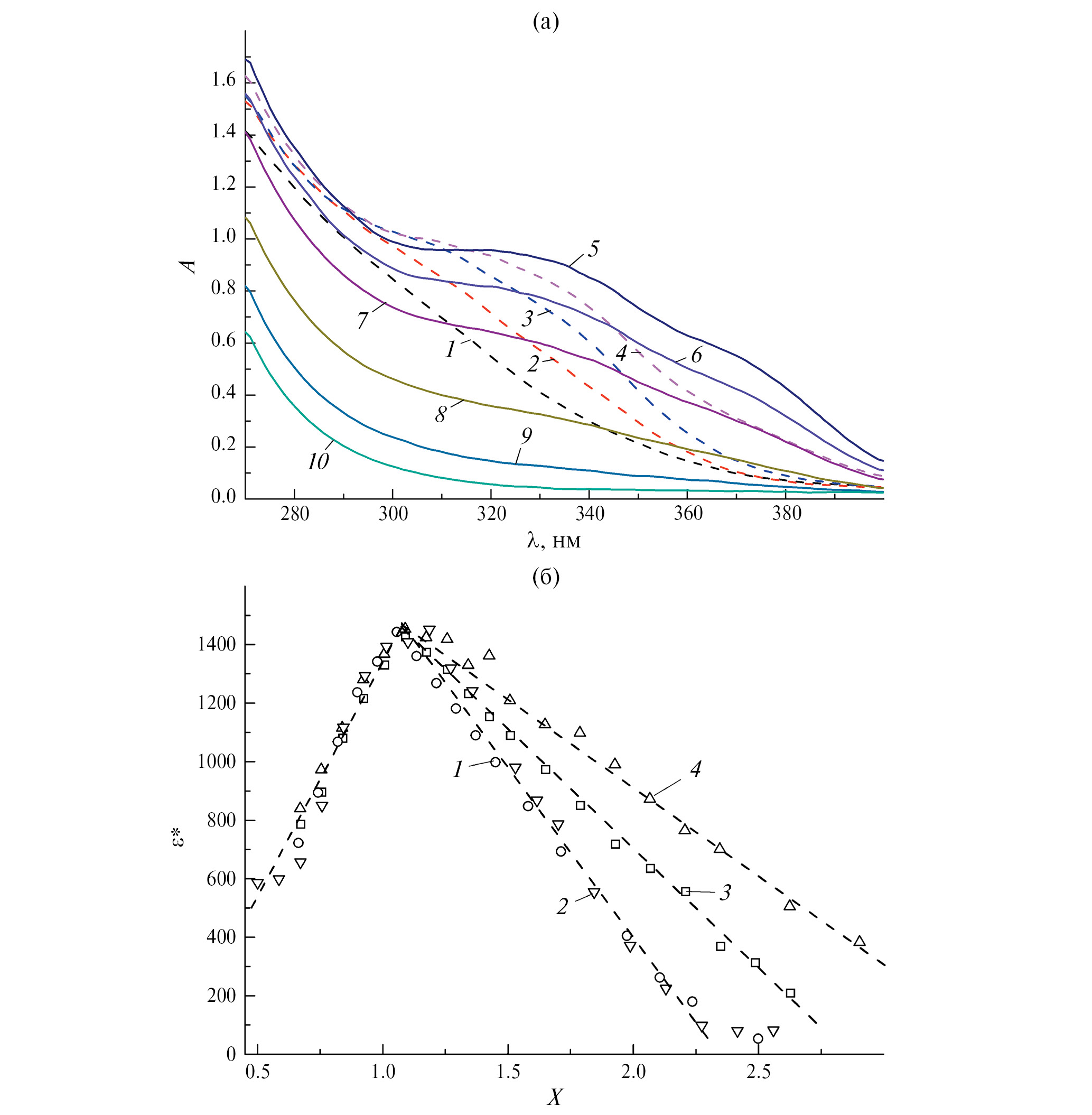 Рис. 1. а) УФ-спектры растворов для pH 7.20. CAu = (7.0–5.4) × 10–4, CGS = (3.5–13.9) × 10–4 M. X = 0.5 (1), 0.75 (2), 0.84 (3), 0.93 (4), 1.19 (5), 1.36 (6), 1.53 (7), 1.84 (8), 2.13 (9), 2.56 (10). б) зависимости ε* (= A/lCAu) от X (= CGS/CAu) для pH: 7.20 (1), 6.66 (2), 6.36 (3), 6.06 (4).