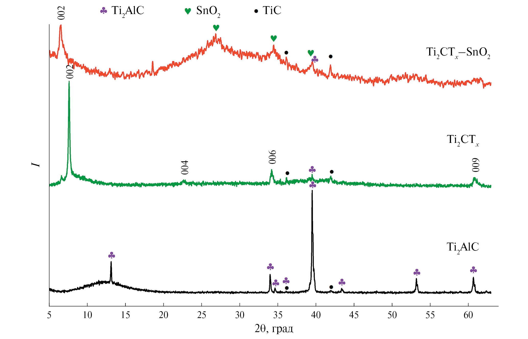 Рис. 1. Рентгенограммы порошков исходной МАХ-фазы Ti2AlC, синтезированного многослойного максена Ti2CTx и рецепторного слоя нанокомпозита Ti2CTx–10 мол. % SnO2.