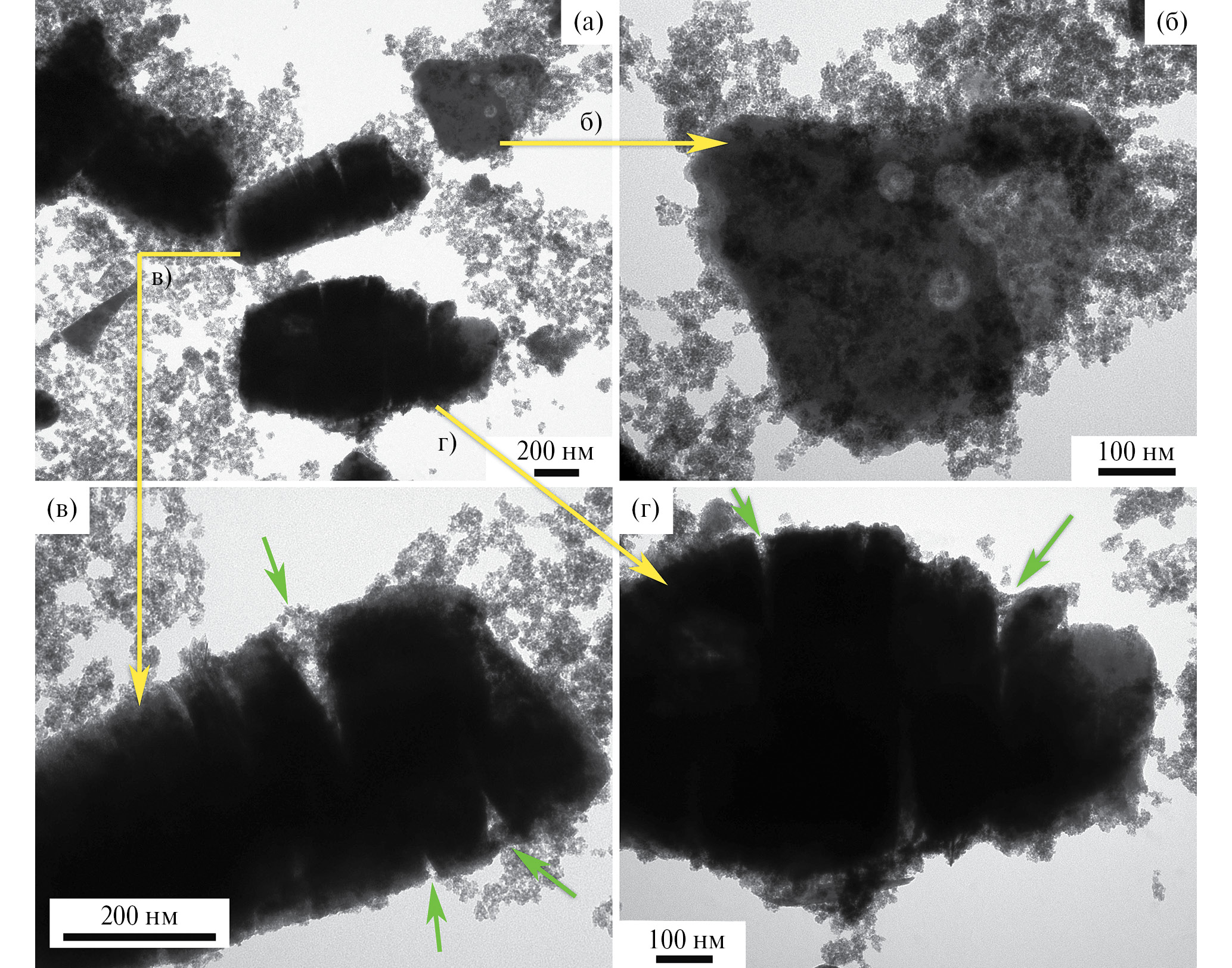 Рис. 2. Микроструктура композиционного порошка Ti2CTx–10 мол. % SnO2 по данным ПЭМ. Зелеными стрелками обозначено внедрение наночастиц SnO2 между слоями аккордеоноподобного максена Ti2CTx.