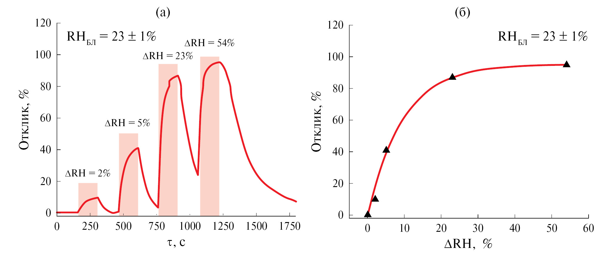 Отклик при изменении влажности рассчитывали по следующей формуле: