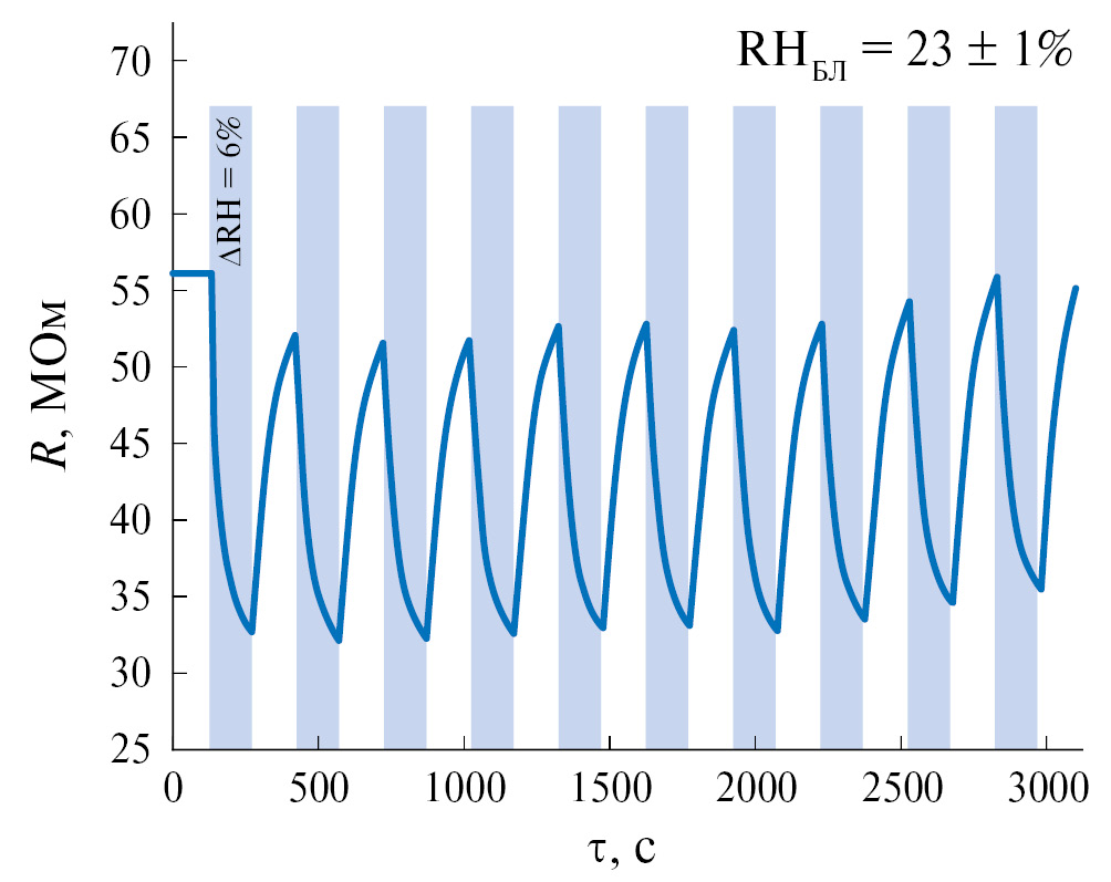 В связи с перспективностью полученного нанокомпозита Ti2CTx–SnO2 в качестве рецепторного материала для детектирования влажности далее более подробно была изучена чувствительность к ее изменению (рис. 5). На рис. 6 представлена воспроизводимость отклика на изменение ΔRH = 6%. Видно, что при увеличении влажности на 6% наблюдается уменьшение сопротивления. При этом через несколько циклов напуска аналита происходит небольшой дрейф значений, что может быть связано и с незначительным изменением температуры окружающей среды. При проведении эксперимента не производилась термостабилизация барботера при создании влажной среды, поэтому даже незначительное изменение окружающей температуры могло привести к изменению положения базовой линии, что для гиперчувствительного к влажности и рабочей температуре максена является очень заметным. На рис. 5 представлены отклики на ΔRH = 2, 5, 23 и 54%. Показано, что при увеличении влажности происходит и увеличение откликов до 10, 41, 88 и 95% соответственно. Полученные данные свидетельствуют о заметной чувствительности максена к изменению влажности в широком диапазоне значений уже при комнатной температуре, что сильно отличает данный класс материалов от более классических – полупроводниковых оксидов металлов, для которых отклики на аналиты появляются при повышенных температурах.