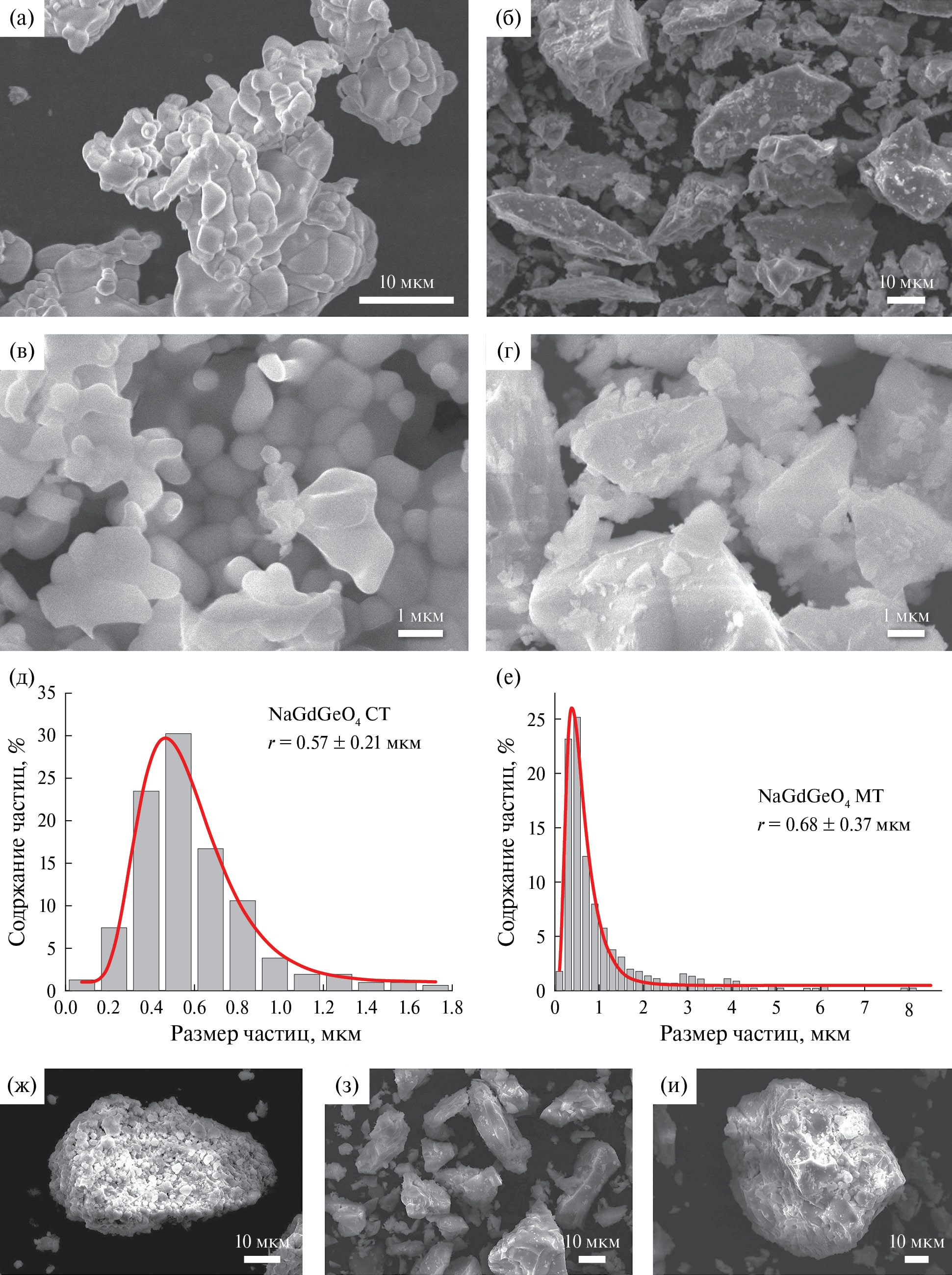 Для изучения морфологии поверхности синтезированных образцов были получены СЭМ-изображения. Зерна порошков NaY0.975Tm0.025GeO4 ЖФ и ТФ имеют преимущественно неправильную форму и формируют агломераты (рис. 2а, 2б). Поскольку частицы образца, полученного в результате твердофазного синтеза, были несколько оплавлены, определить действительный средний размер частиц не представляется возможным. Однако такое исследование было проведено для матрицы NaGdGeO4 СТ и МТ (рис. 2в, 2г). Средний размер зерен (r) NaGdGeO4 СТ составил r = 0.57 ± 0.21 мкм, в то время как для NaGdGeO4 МТ распределение частиц по размерам несколько шире: r = 0.68 ± 0.37 мкм (рис. 2д, 2е). На рис. 2в и 2г хорошо видно, что в отличие от образца, отожженного в стандартной муфельной печи, образец после обработки в СВЧ-печи состоит из частиц более правильной формы, близкой к сферической. Это также наблюдалось на СЭМизображениях образцов С (рис. 2ж), М (рис. 2з), МА (рис. 2и) состава NaY0.875Bi0.025Eu0.1GeO4 аналогично составу NaY0.975Bi0.025GeO4. При более детальном сравнении снимков СЭМ, представленных на рис. 2е, 2ж, видно, что агломераты частиц образцов, отожженных в атмосфере аргона, менее оплавлены, что, вероятно, является следствием меньшего времени отжига.