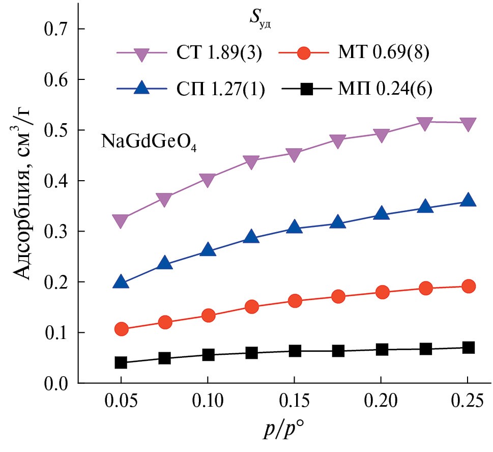 Поскольку отжиг в СВЧ-печи должен приводить к увеличению плотности спекания и, следовательно, уменьшению пористости образцов, целесообразно было сравнить удельную поверхность после отжига в муфельной и СВЧ-печи. Таким образом, для всех образцов состава NaGdGeO4 были изучены изотермы адсорбции (рис. 3). Рассчитанные значения удельной поверхности Sуд свидетельствуют о низкой пористости исследуемых материалов. Примечательно, что удельная поверхность образцов NaGdGeO4 СТ и СП несколько больше, чем у образцов МТ и МП состава NaGdGeO4 (рис. 3), что, вероятно, связано с меньшей дисперсностью последних.