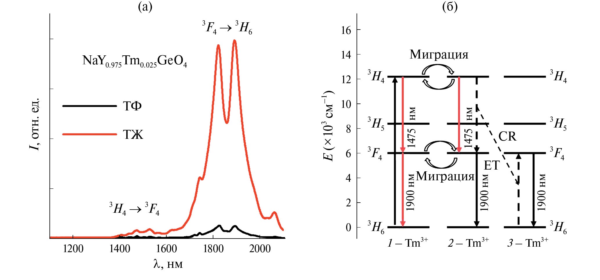 Спектры люминесценции образцов ЖФ и ТФ состава NaY0.975Tm0.025GeO4 получены в диапазоне длин волн 1100–2100 нм при λex = 808 нм (рис. 4а). Представленные спектры содержат две широкие полосы в диапазонах 1300–1600 нм и 1600–2100 нм, обусловленные соответственно переходами 3H4 → 3F4 и 3F4 → 3H6 иона Tm3+ (рис. 4б). В работе [25] показано, что девозбуждение из состояния 3H4 может протекать двумя способами: за счет каскадной релаксации и миграционно-ускоренной кросс-релаксации в состояние 3F4 (в этом случае ионы Tm3+ играют роль как активатора, так и сенсибилизатора). Переход 3F4 → 3H6 также является миграционно-ускоренным (рис. 4б).