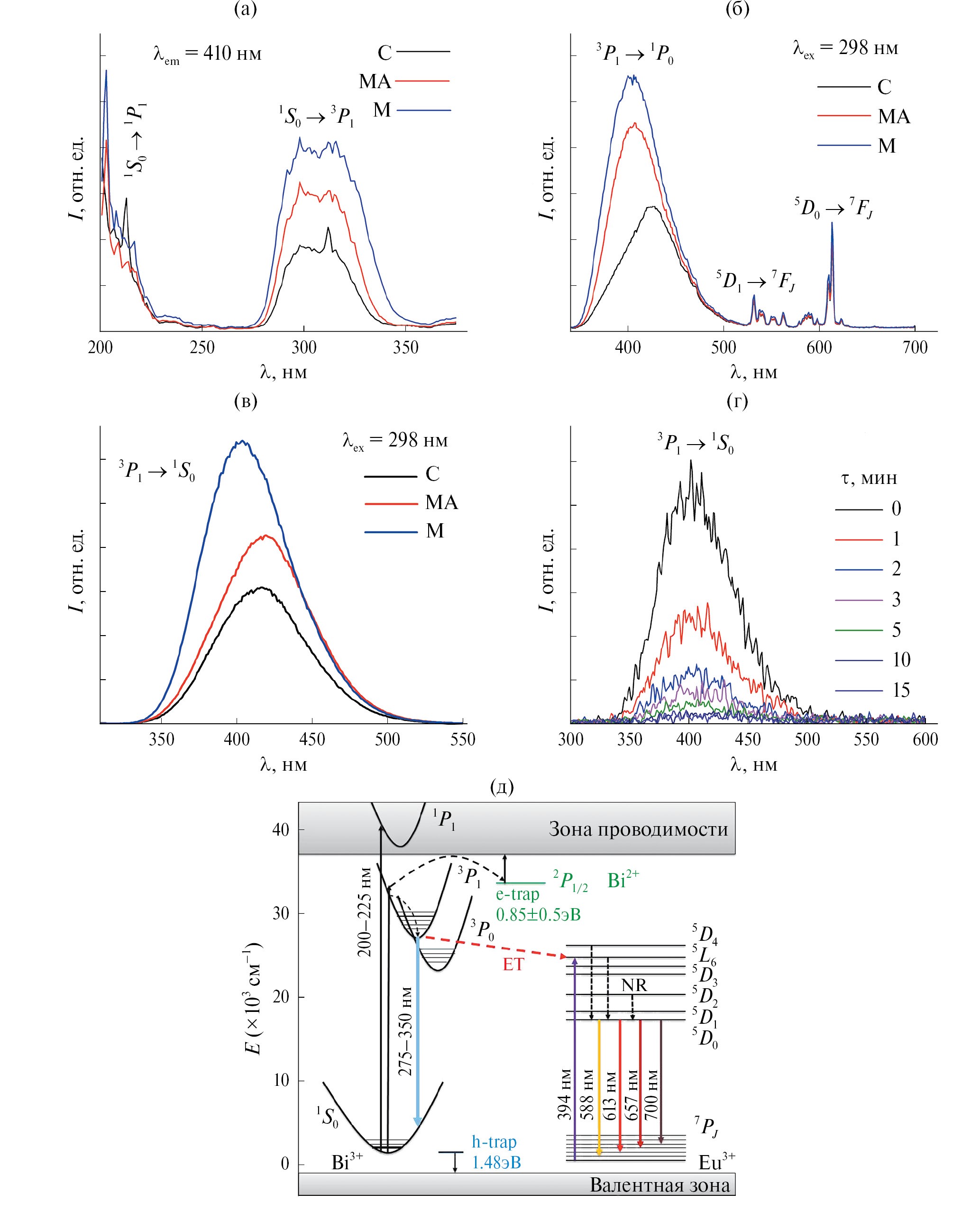 На рис. 6а, 6б представлены спектры возбуждения и фотолюминесценции образцов С, М, МА состава NaY0.875Bi0.025Eu0.1GeO4. В спектрах возбуждения при λem = 410 нм присутствуют две широкие линии в диапазонах 200–250 и 275–350 нм, связанные с переходами 1S0 → 1P1 и 1S0 → 3P1 иона Bi3+ соответственно. Примечательно различное влияние условий отжига на описанные процессы. В случае возбуждения образцов в полосу, соответствующую переходу 1S0 → 1P1, интенсивность люминесценции была близкой для всех трех образцов и достигала максимума для образца С, отожженного в СВЧ-печи, как и в случае NaGdGeO4. Диаметрально противоположная картина наблюдается, когда возбуждение осуществляется в полосу, связанную с переходом 1S0 → 3P1, в этом случае максимальной интенсивностью свечения обладает образец М. Вероятно, данный факт обусловлен морфологическими свойствами образца NaY0.875Bi0.025Eu0.1GeO4 (М), а именно большим размером частиц, в результате более длительного спекания. Как следствие, в таких образцах больше вероятность формирования висмутовой пары. Возможная схема передачи энергии между ионами Bi2+, Bi3+ и Eu3+ продемонстрирована на рис. 6д. Уровни Bi2+, выступающие в качестве ловушек, расположены близко к уровню 3P1 ионов Bi3+, и их дезактивация, вероятно, способствует возбуждению ионов Bi3+. Таким образом, можно предположить, что для образцов NaY0.975Bi0.025GeO4 и NaY0.875Bi0.025Eu0.1GeO4, синтезированных в муфельной печи на воздухе (М), будет наблюдаться более длительное послесвечение. Влияние дефектов на состояние 1P1 минимально ввиду его удаленности от подуровня Bi2+. Малое содержание ионов Bi2+ не позволяет экспериментально определить и соотнести количество дефектов при различных условиях отжига.