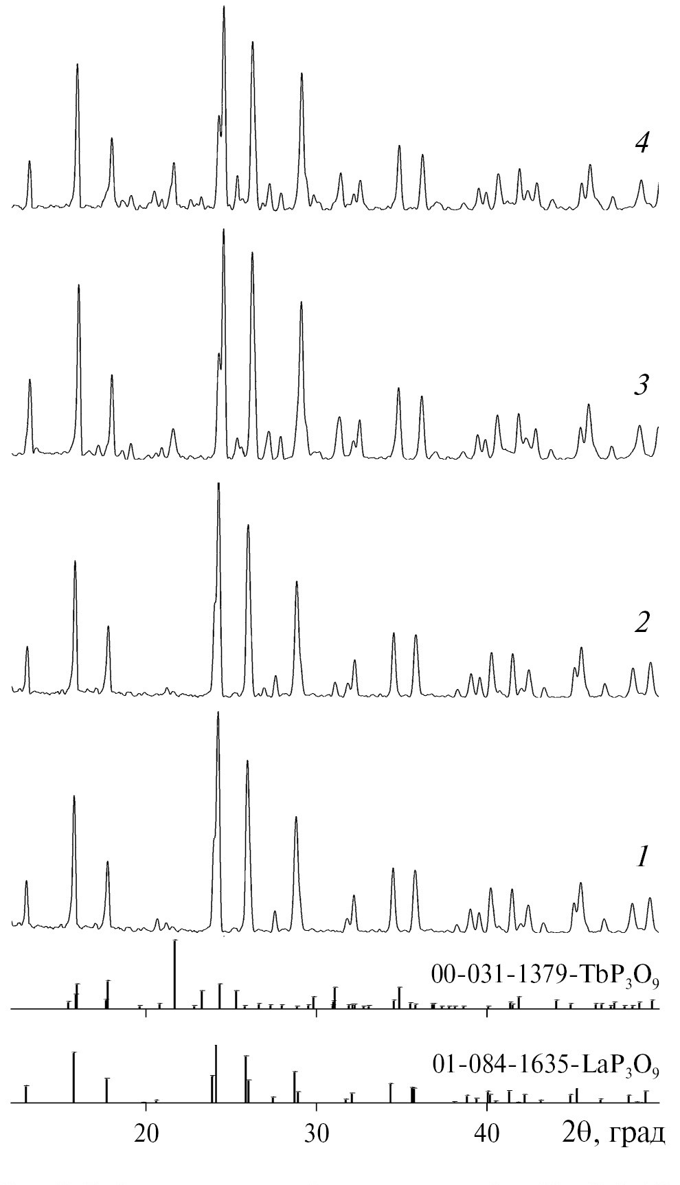 В соединениях La1–хTbхP3O9 (х = 0.30, 0.40) появляется вторая фаза метафосфата тербия TbP3O9 моноклинной модификации (пр. гр. P21/c (14), а = 11.258, b = 20.220, с = 10.138 Å, α = 90о, β = 97.150о, γ = 90о, Z = 12, Vэл. яч = 2289.835 Å3) (рис. 2, кривые 3, 4). В структуре TbP3O9 редкоземельные ионы расположены внутри слегка искаженных октаэдров TbO6, изолированных друг от друга тетраэдрами PO4 [11, 16].