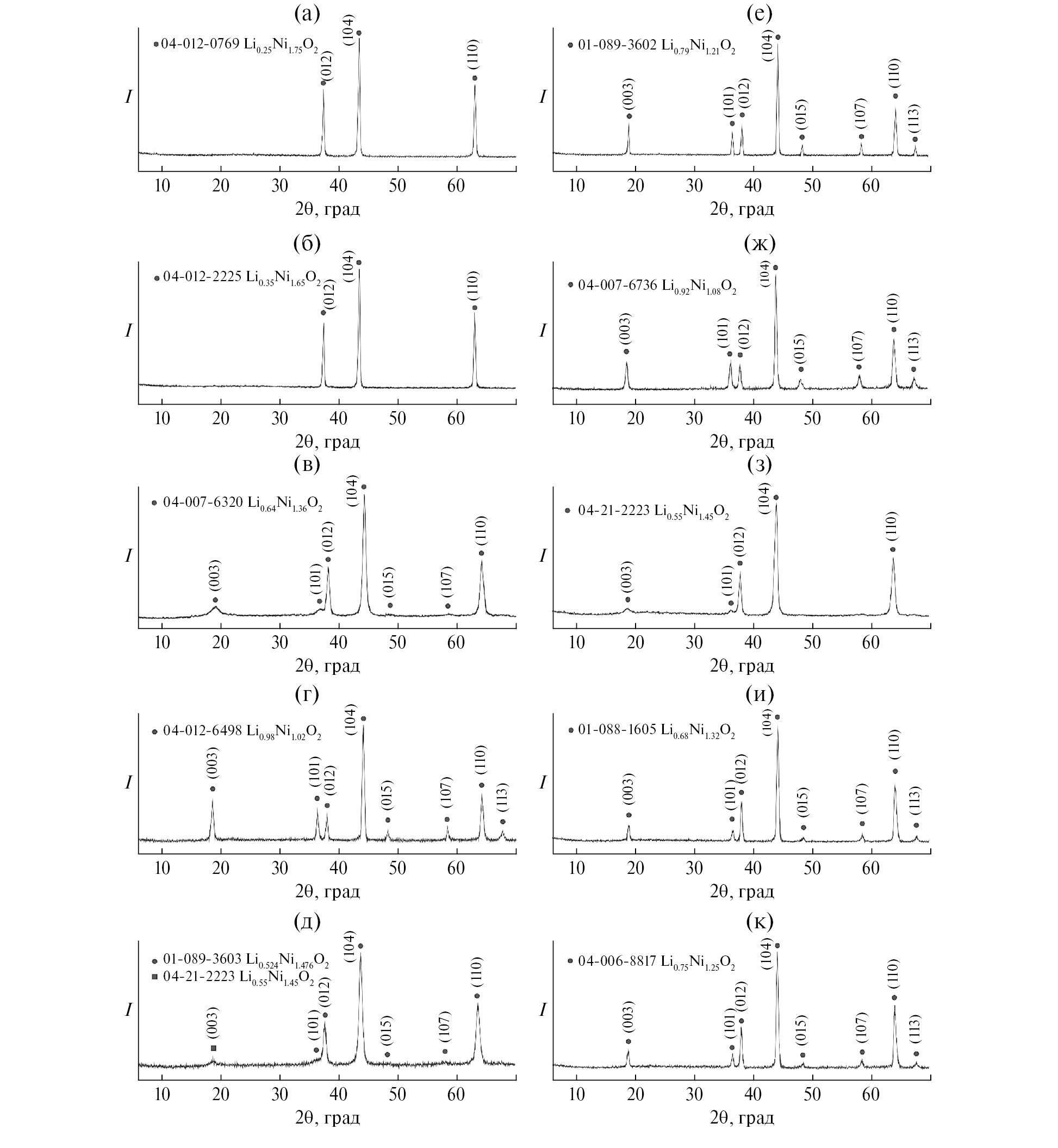 Рис. 1. Рентгенограммы образцов: а – Li0.25Ni1.75О2, б – Li0.35Ni1.65О2, в – Li0.64Ni1.36О2, г – Li0.98Ni1.02О2, д – Li0.524Ni1.476О2, е – Li0.79Ni1.21О2, ж – Li0.92Ni1.08О2, з – Li0.55Ni1.45О2, и – Li0.68Ni1.32О2, к – Li0.75Ni1.25О2.