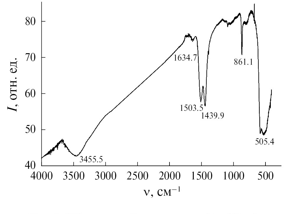 Инфракрасные спектры с преобразованием Фурье (FTIR) могут быть использованы для определения кристаллической структуры и молекулярного состава стехиометрического или близкого к стехиометрии наноразмерного образца никелата лития [29]. На рис. 2 представлен ИК-спектр образца Li0.98Ni1.02O2, по составу близкого к стехиометрическому. Видно, что интенсивные пики поглощения проявляются в области 500–1630 см–1. Пики поглощения при 505.4, 861.1, 1439.9 и 1503.5 см–1 являются типичными для никелата лития стехиометрического состава (LiNiО2), что согласуется с данными работы [32], где утверждается, что данные пики поглощения можно использовать для идентификации стехиометрического никелата лития. Кристалл никелата лития является сложным оксидным соединением, в котором слой ионов Li расположен между слоями Ni и O. Пик поглощения при 505.4 см–1 соответствует симметричному пику колебаний растяжения и сжатия связей M–O–M (M = Li, Ni) [30, 31]. Пики при 1439.9 и 1503.5 см–1 относятся к энергии связи Ni–O и Ni=O соответственно. Их близость объясняется гомогенизацией валентных электронов. Полосы поглощения в области 3400–3850 см–1 принадлежат ОН-группам молекул воды [32].