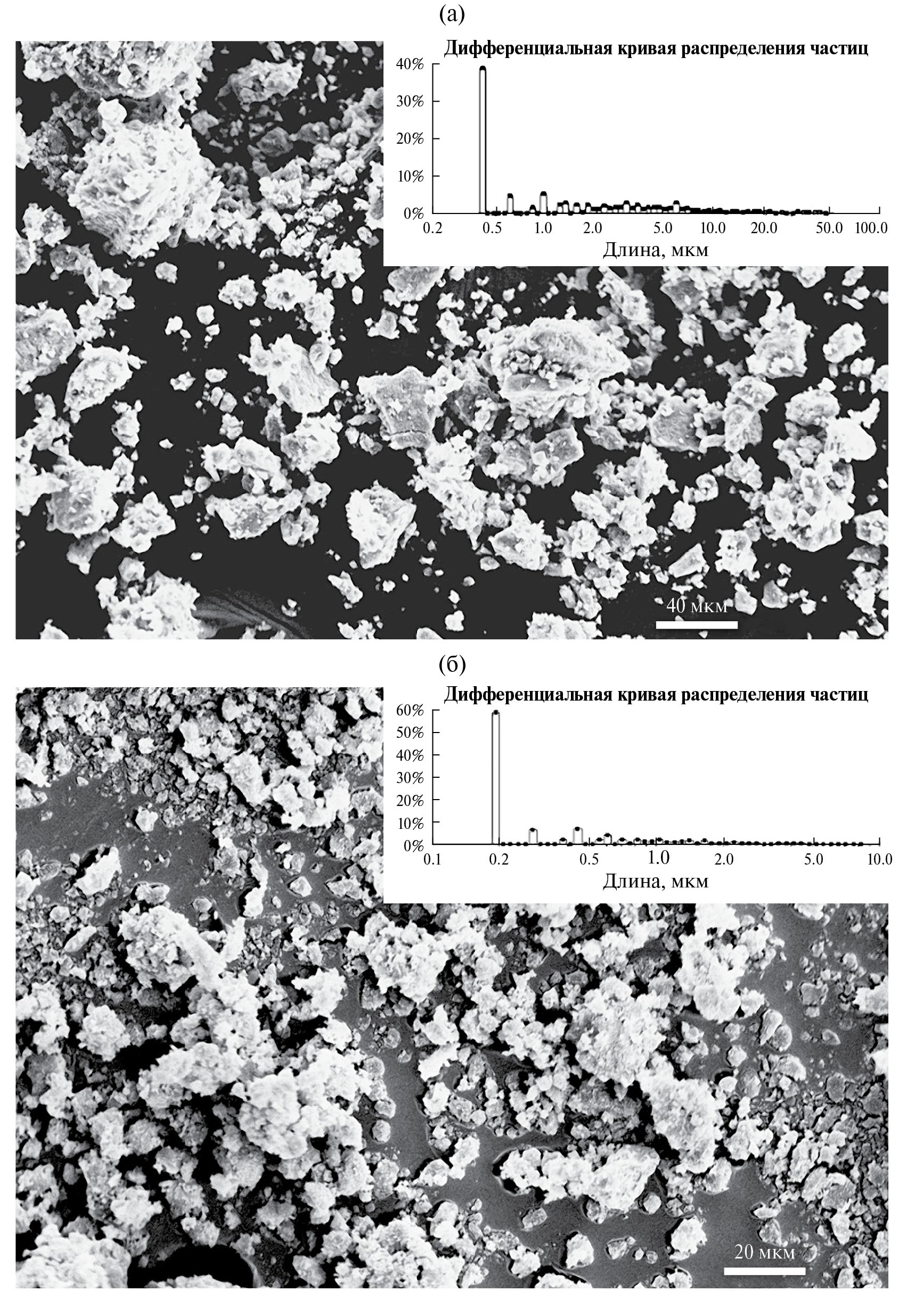 Провели исследования морфологии синтезированных образцов с помощью РEM-микроскопии (рис. 4). Полученные изображения анализировали с помощью программного обеспечения ScanMaster, позволяющего определять гранулометрический состав. Как видно из результатов анализа (вставки гистограмм на рис. 4), размер частиц синтезированных соединений Li0.79Ni1.21О2 и Li0.98Ni1.02О2 неоднороден, но при этом преобладают частицы преимущественно одного размера (табл. 2) для каждого из составов. Морфология частиц различная. Можно предположить, что преобладание одного размера частиц хорошо развитой удельной поверхности может оказать положительное влияние на электрохимические свойства катодных материалов на основе никелатов лития для литий-ионных аккумуляторов.