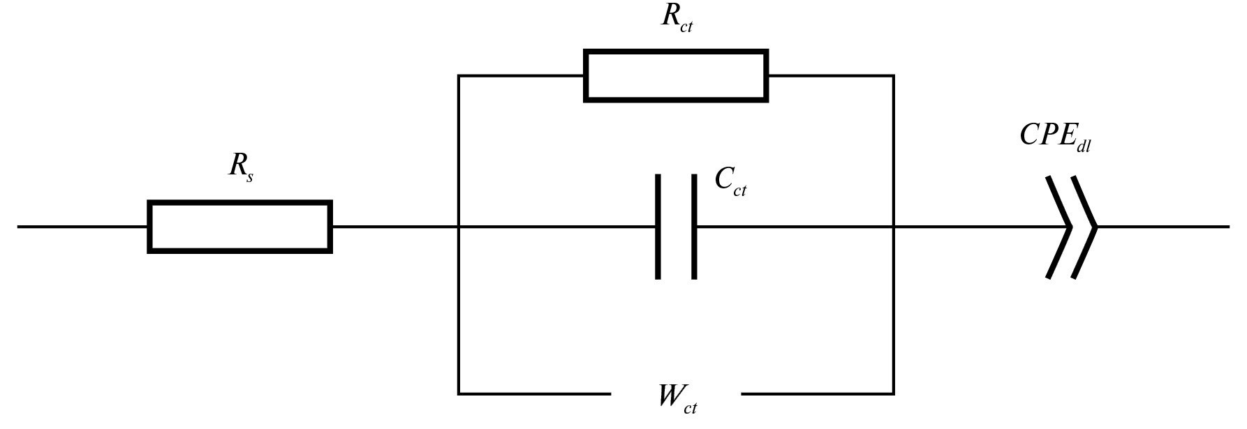 В высокочастотной области спектра годографы импеданса имеют вид искаженной полуокружности с центром, расположенным ниже оси абсцисс (рис. 5, 6), что обусловлено параллельным RC-соединением. Искаженная полуокружность может быть смоделирована различными схемами замещения [33–35]. Выбрана схема, показанная на рис. 7, так как она наиболее точно отражает физическую природу процессов и удовлетворительно моделирует экспериментальные годографы. Данную схему замещения применяли для описания спектра импеданса литиевого электрода в исследованиях [36, 37]. Выбор схемы с импедансом Варбурга является обоснованным для рассматриваемых спектров, поскольку начальная часть высокочастотной области в небольшом интервале линейна, что характерно для диффузионных процессов. Низкочастотная область спектра годографа импеданса в виде наклонной прямой моделируется элементом постоянной фазы (CPE) и связана с возникновением двойного электрического слоя на границе образец–электрод.