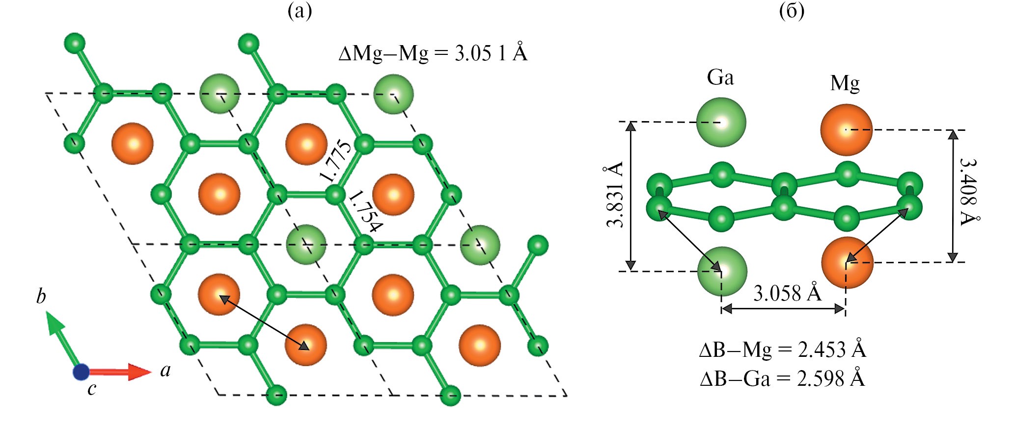Базис решетки Браве составляют шесть атомов бора, два атома галлия и четыре атома магния со стехиометрическим соотношением 1 : 2 : 3 (Ga : Mg : B). Атомы бора формируют идеально плоскую гексагональную решетку, находящуюся между двумя гетероатомными слоями, в которых атомы галлия и магния расположены апикально с двух сторон относительно центров борных шестиугольников. Рассчитанные расстояния B–Ga и B–Mg составляют 2.598 и 2.453 Å. Борная решетка имеет два типа связей: длина связи между атомами бора, формирующими цикл, над которым расположен атом галлия, составляет 1.754 Å, а длины связей B–B, соединяющих борные циклы с апикальными атомами галлия, равны 1.775 Å (рис. 2). Такие экзоциклические связи B–B незначительно (0.025 Å) превышают сумму ковалентных радиусов атомов бора, а эндоциклические – фактически равны длине одинарной связи B–B (1.75 Å [40]). В то же время расстояния B–Ga и B–Mg превышают соответственно сумму ковалентных радиусов B–Ga на 0.468 Å (dcov = 2.130 Å) B–Mg на 0.213 Å (dcov = 2.224 Å). При этом расстояния между соседними атомами магния равны 3.051 Å, что превышает сумму ковалентных радиусов (dcov = 2.720 Å) на 0.331 Å. Расстояние Ga–Mg практически равно расстоянию Mg–Mg и составляет величину 3.058 Å, которая превышает сумму ковалентных радиусов (dcov = 2.61 Å) на 0.448 Å.
