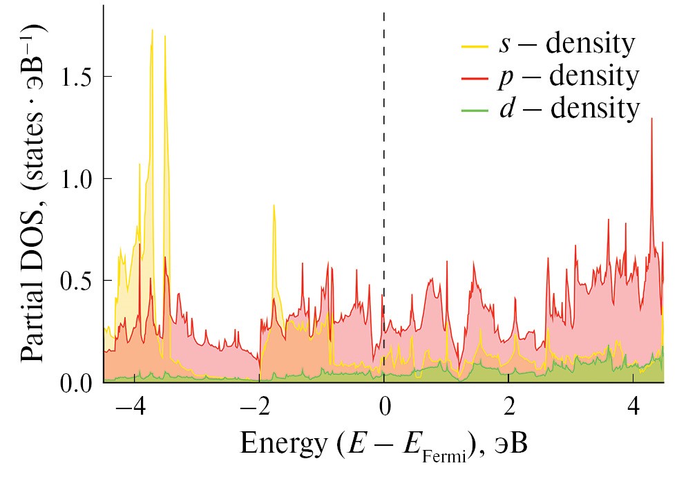 Рис. 5. Частичная плотность электронных состояний, образованная атомами бора. Вертикальной пунктирной линией отмечен уровень Ферми.