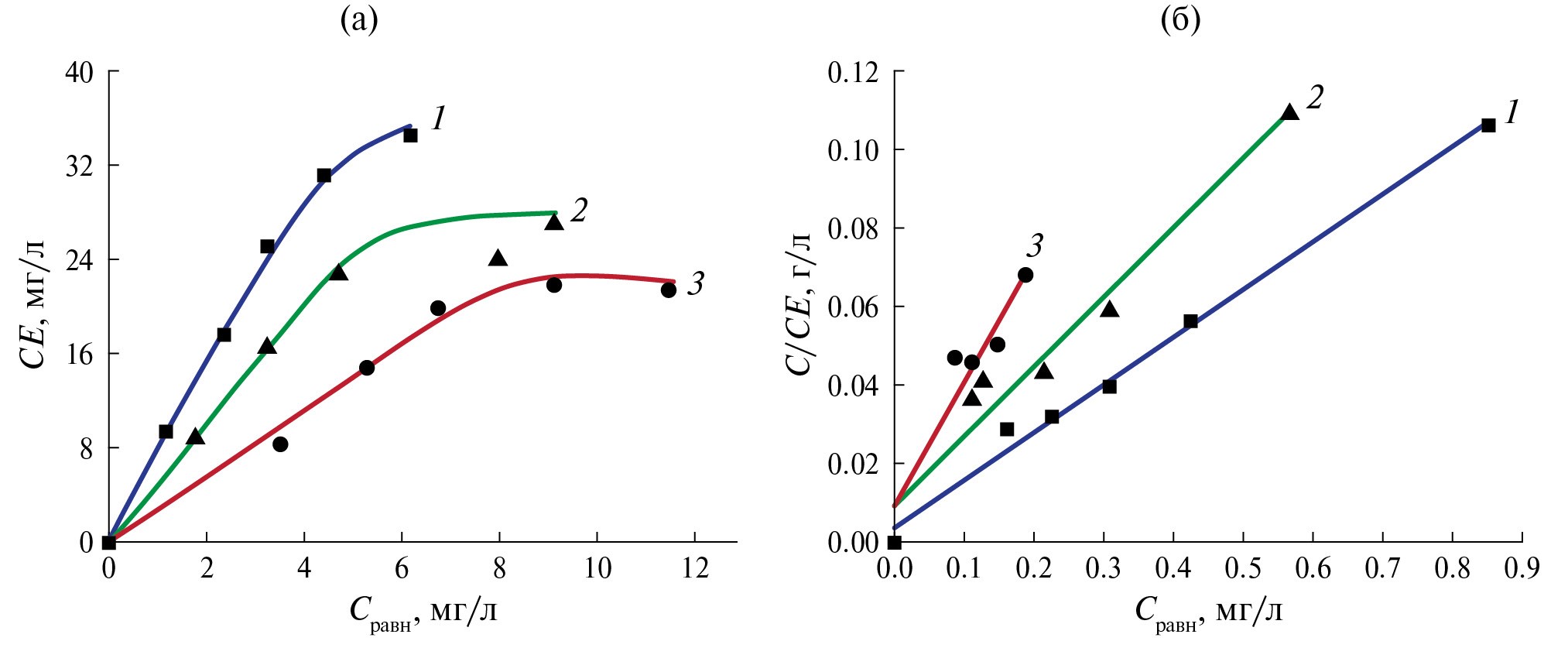 где СЕ – сорбционная емкость, мг/г; СЕ∞ – максимальная сорбционная емкость, мг/г; K – константа Ленгмюра, мл/г; C – равновесная концентрация металла в растворе после сорбции, мг/л.