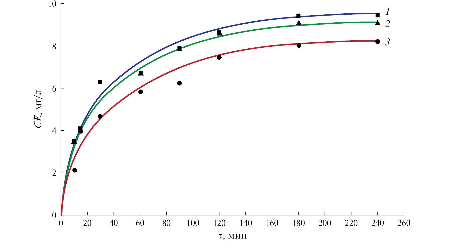 Аппроксимация кинетических данных по этим моделям (рис. 4) показала, что наибольший коэффициент корреляции (табл. 2) наблюдается при применении модели псевдовторого порядка.