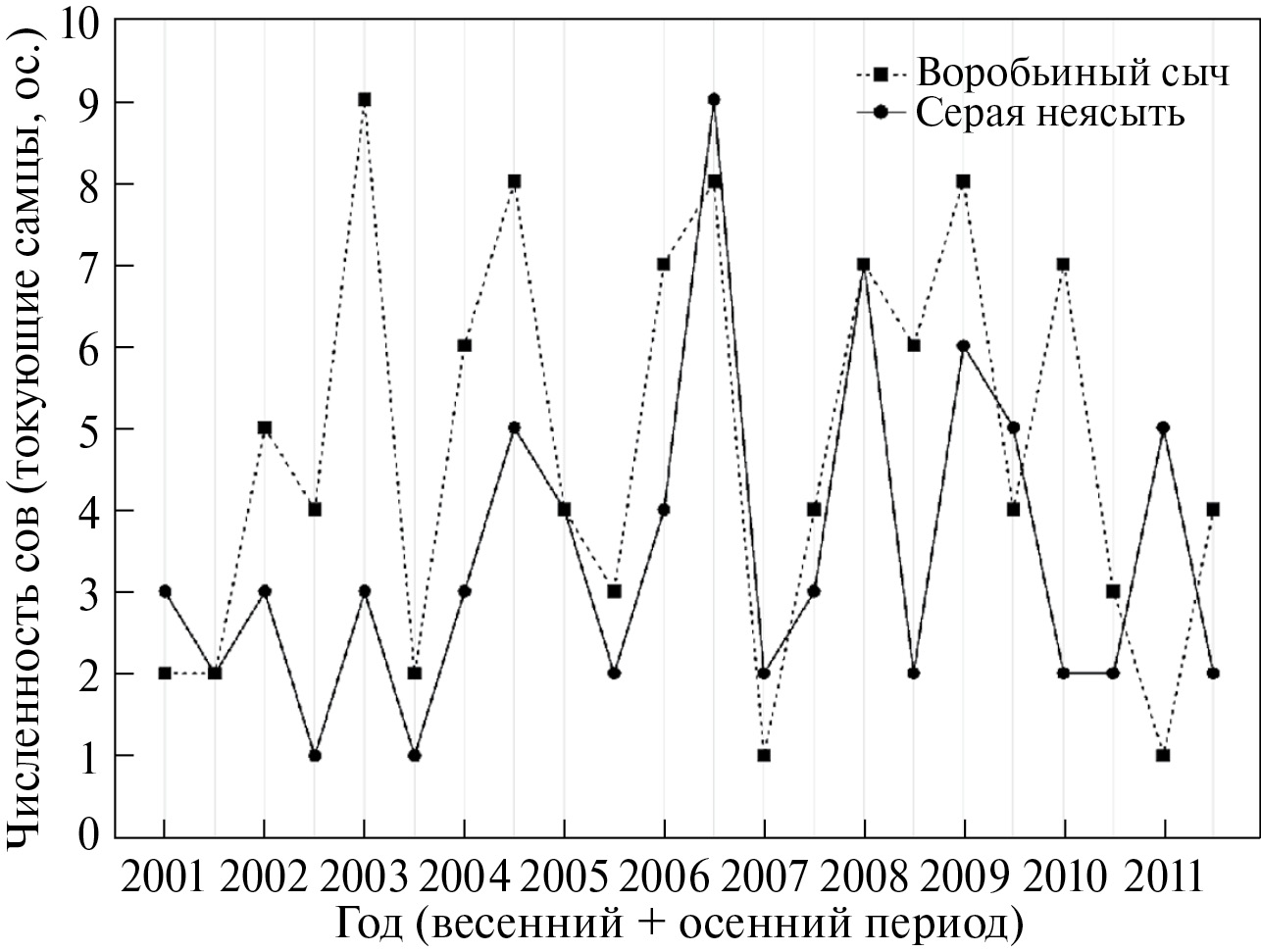 Рис. 1. Динамика численности (для каждого года весной и осенью) токующих самцов обоих видов сов изучаемой территории (основной участок 4.2 км2) в 2001–2011 гг.