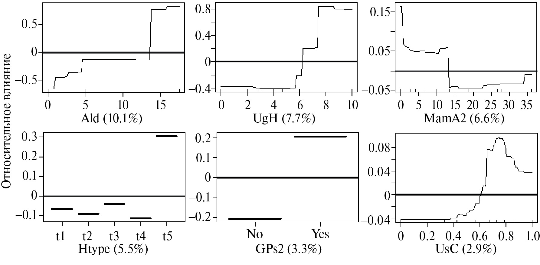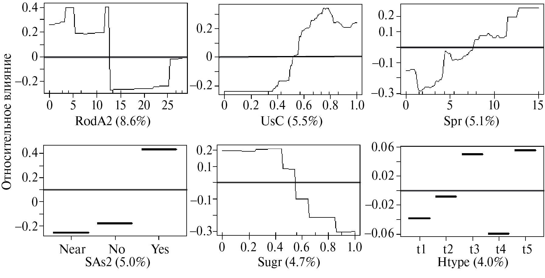 Рис. 5. Графики, показывающие влияние выбранных независимых переменных на осеннюю встречаемость токующих самцов серой неясыти в квадратах. Описание графиков как на рис. 2. Расшифровка кодов параметров приведена в табл. 1.
