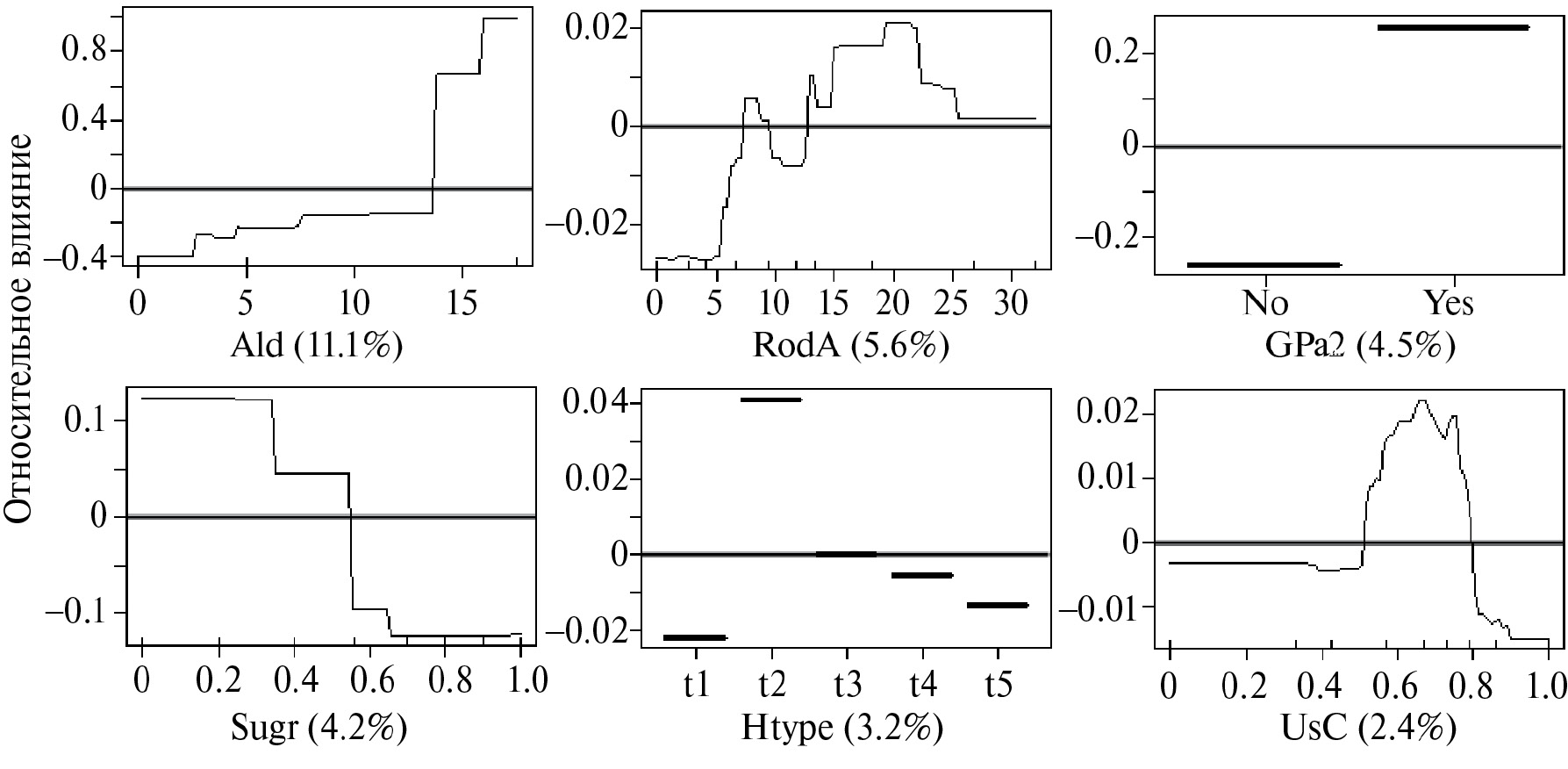 Рис. 3. Графики, показывающие влияние выбранных независимых переменных на осеннюю встречаемость токующих самцов воробьиного сыча в квадратах. Описание графиков как на рис. 2. Расшифровка кодов параметров приведена в табл. 1.