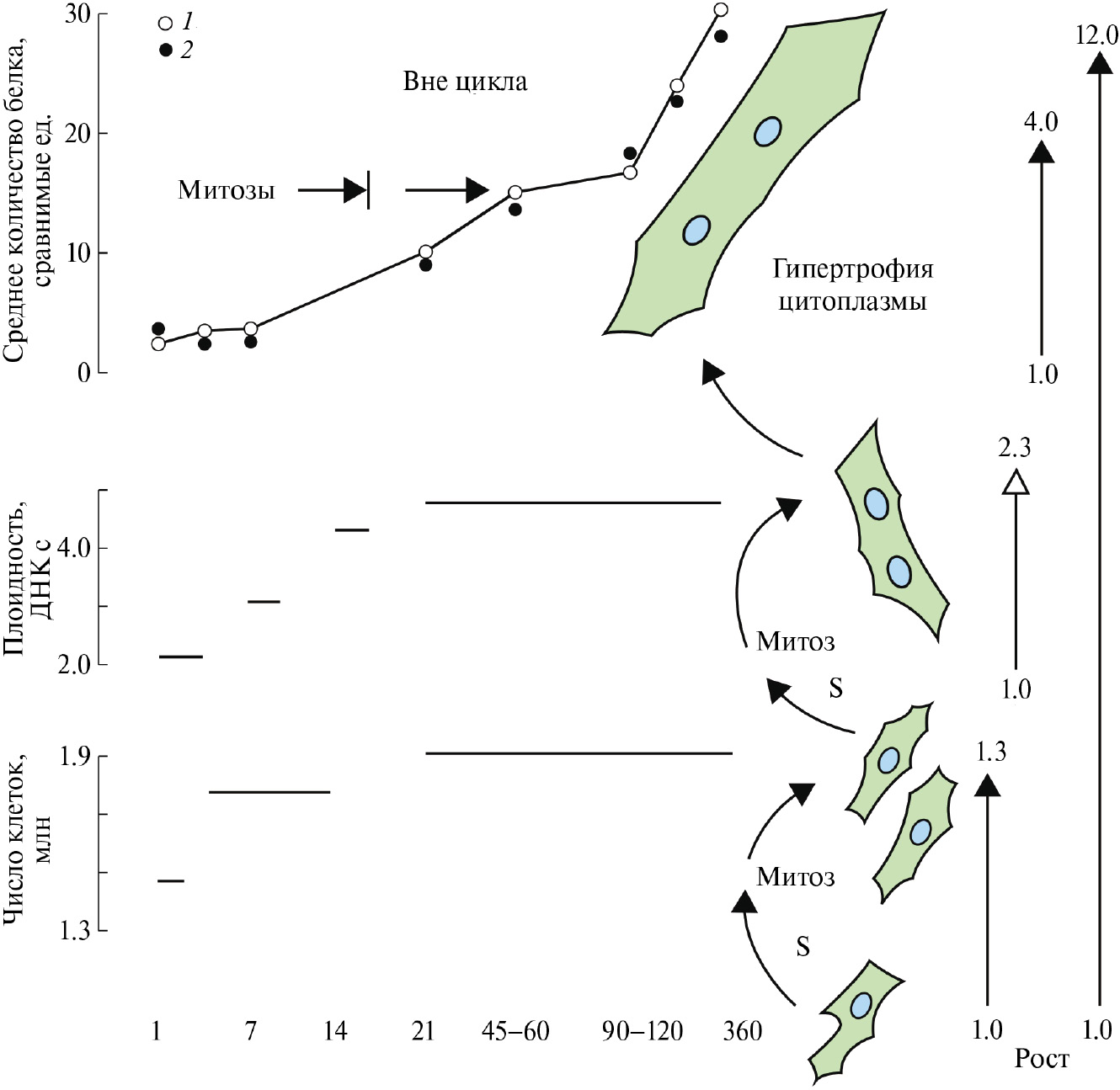 На рис. 1 приведена обобщенная схема роста миокарда мыши до года ее жизни. В первые дни после рождения вес миокарда увеличивается примерно на треть за счет делений клеток, в это время диплоидных. Последующая полиплоидизация, укрупнение клеток приводят к увеличению массы миокарда более чем в 2 раза, а постмитотический рост цитоплазмы — еще в 4 раза. У человека вес сердца увеличивается наиболее интенсивно в первые годы жизни и в период полового созревания, до 18 лет. Митозы в кардиомиоцитах человека прекращаются в 9–12 лет (Takamasu et al., 1983). Поскольку в миокарде человека нашли размножение миоцитов и последующую полиплоидизацию, а затем и рост цитоплазмы, схема на рис. 1 может характеризовать и кинетику роста миокарда человека. Но конкретный вклад разных способов роста миокарда человека еще предстоит выяснить.