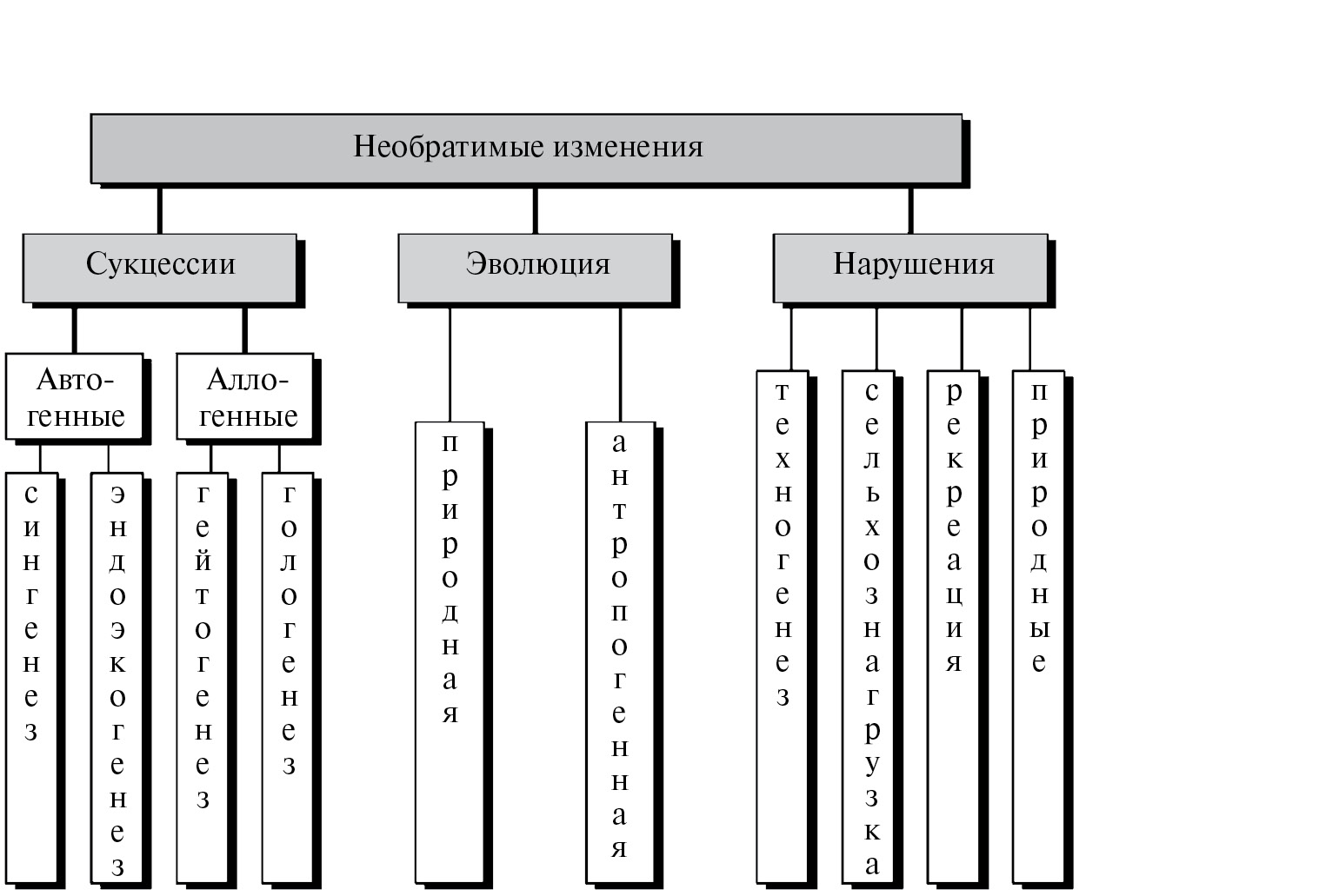 - необратимые (сукцессии, эволюция сообществ, нарушения).