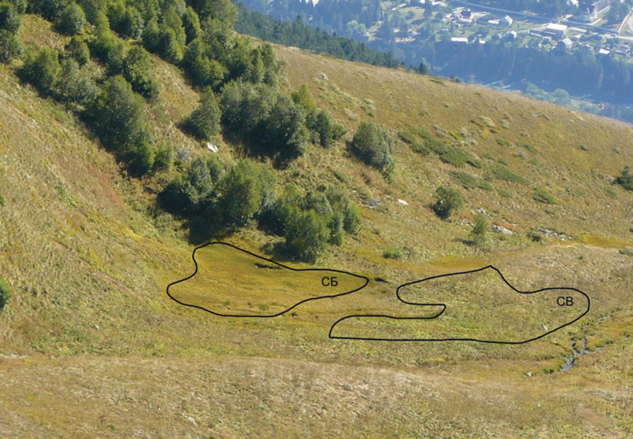 Рис. 1. Субальпийские болота (СБ) и высокотравье (СВ) занимают сходные формы мезорельефа по нижним частям склонов и днищам долин в субальпийском поясе. На фото — участки сообществ в ущелье Малая Хатипара, абсолютная высота 2540 м.