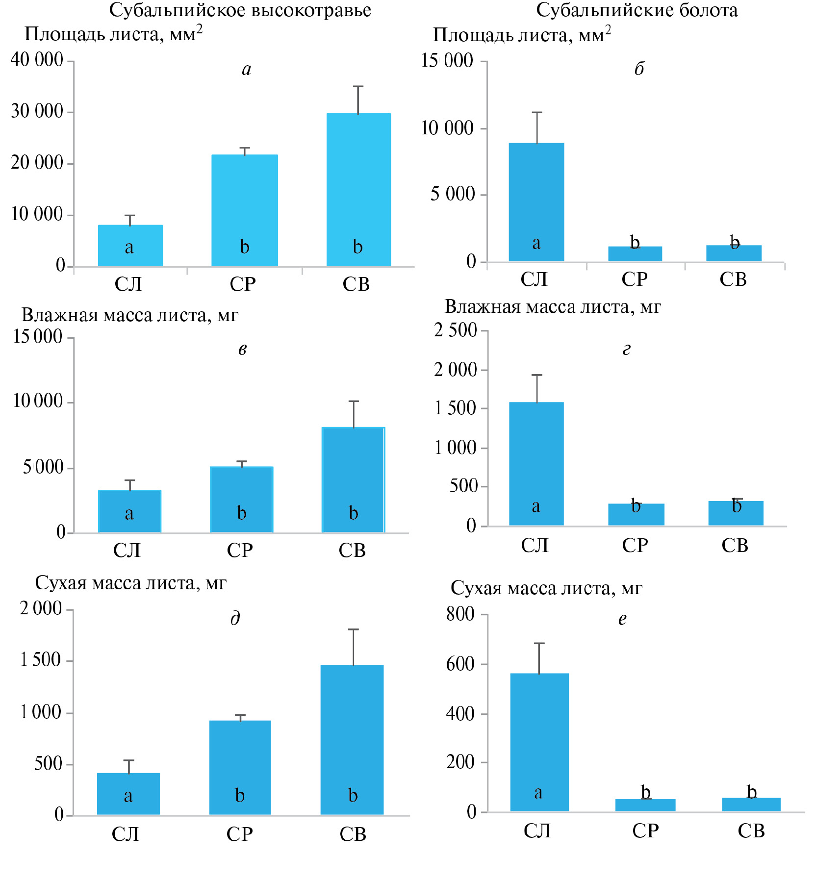 Рис. 2. Размерные признаки (а, б — площадь; в, г — влажная масса; д, е — сухая масса) листа растений субальпийского высокотравья (а, в, д) и субальпийских болот (б, г, е). СЛ — случайная выборка из высокогорной флоры, СР — среднее значение по видам, встреченным на площадках без учета участия, СВ — средневзвешенное по видам с учетом надземной массы растений, n = 100. Вертикальный отрезок показывает ошибку среднего. Значимость различий по критерию Вилкоксона для сопряженных пар отмечена буквами — непересекающиеся буквы показывают отличия на уровне значимости p < 0.05.