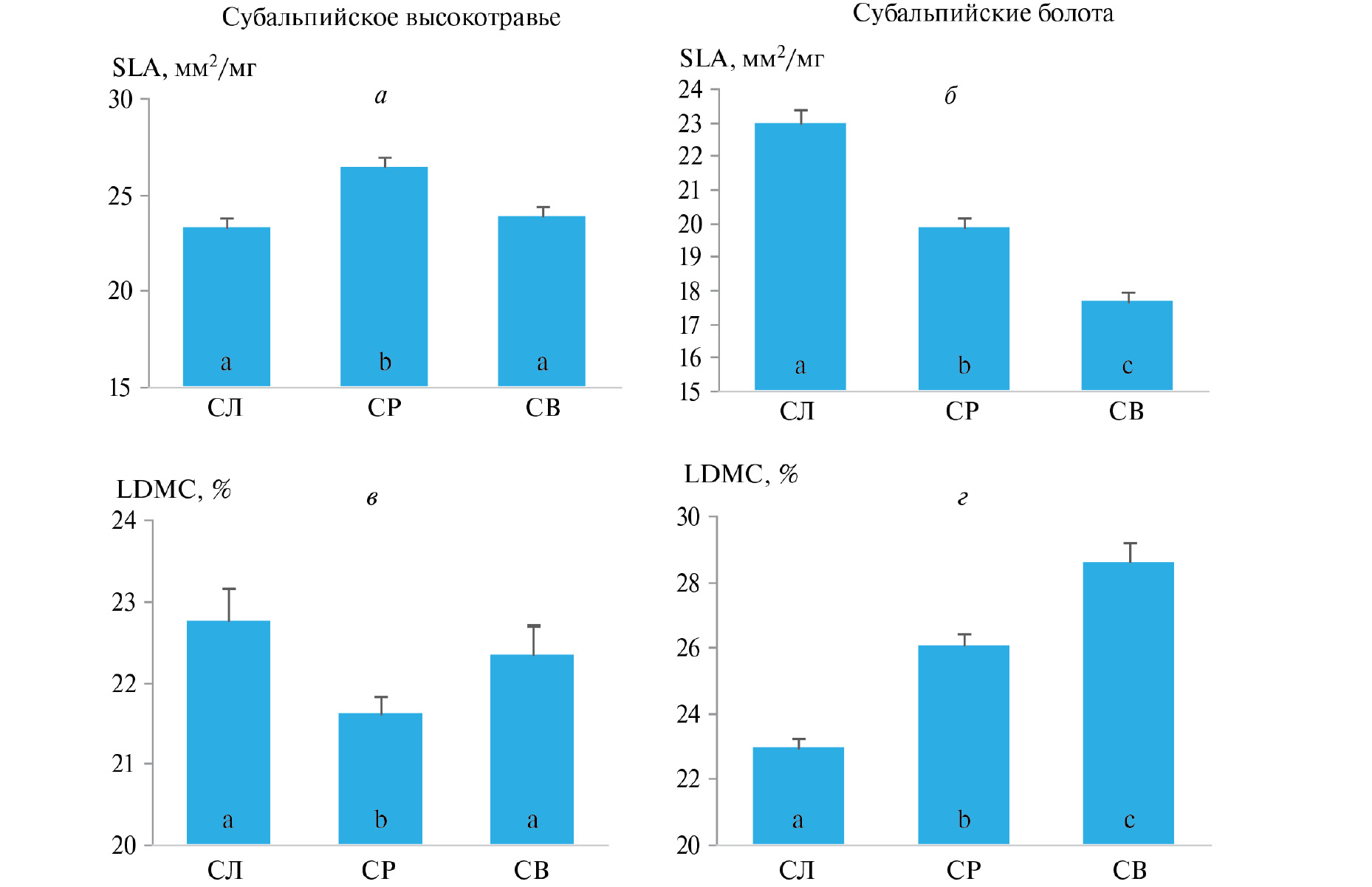 Рис. 3. Удельная листовая поверхность (SLA; а, б) и содержание сухого вещества в листе (LDMC; в, г) листа растений субальпийского высокотравья (а, в) и субальпийских болот (б, г). СЛ — случайная выборка из высокогорной флоры, СР — среднее значение по видам, встреченным на площадках без учета участия, СВ — средневзвешенное по видам с учетом надземной массы растений, n = 100. Вертикальный отрезок показывает ошибку среднего. Значимость различий по критерию Вилкоксона для сопряженных пар отмечена буквами — непересекающиеся буквы показывают отличия на уровне значимости p < 0.05.