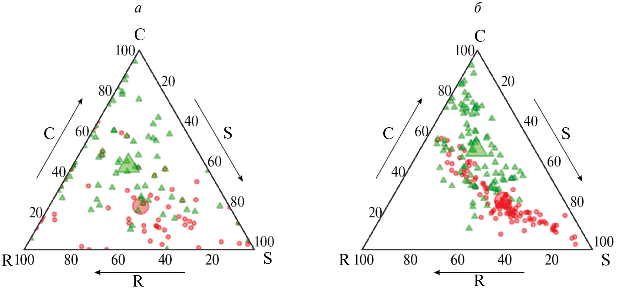 Рис. 5. Ординация видов (а) и средневзвешенных значений по площадкам (б) стратегий в треугольнике Грайма. Красными кружками показаны растения и площадки субальпийских болот, зелеными треугольниками — растения и площадки высокотравья. Крупными фигурами показаны средние (центрированные) значения вклада CSR стратегий.