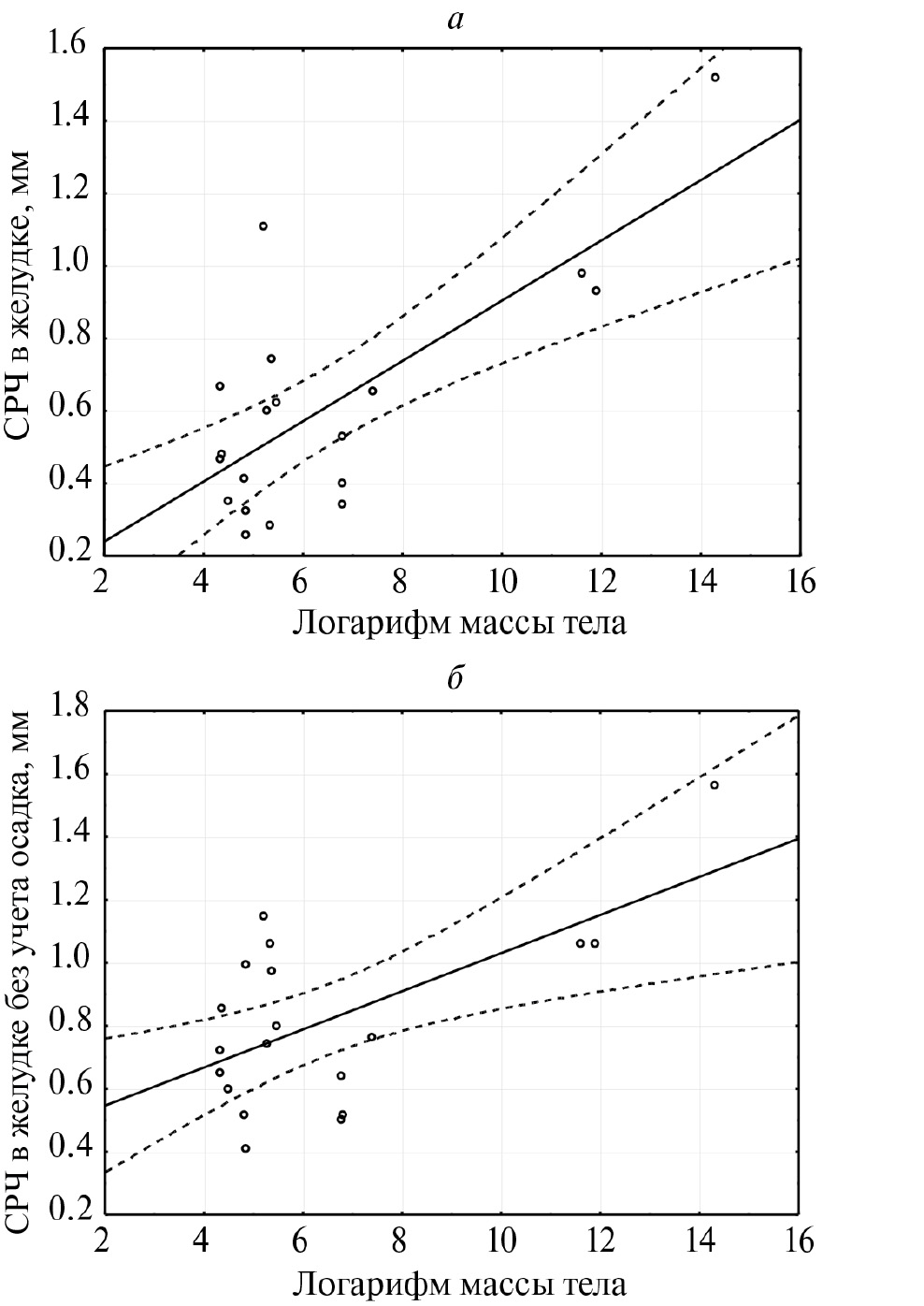 Рис. 1. Зависимость СРЧ в желудке от массы тела при разных вариантах расчета: а — с учетом всех размерных фракций (r = 0.73736), б — без учета осадка (r = 0.61325).