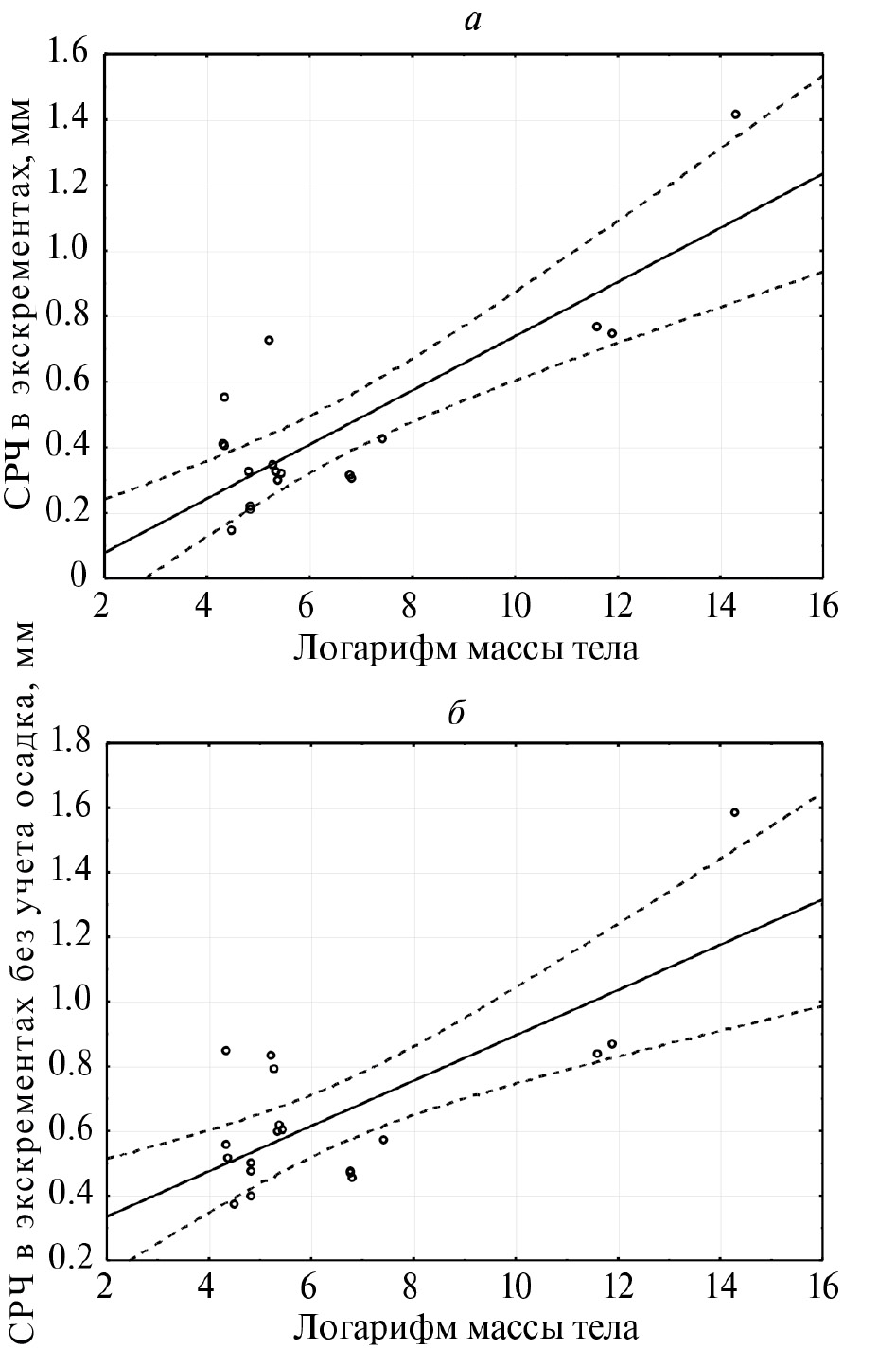 Рис. 3. Зависимость СРЧ экскрементов от массы тела при разных вариантах расчета: а — с учетом всех размерных фракций (r = 0.81085), б — без учета осадка (r = 0.72977).
