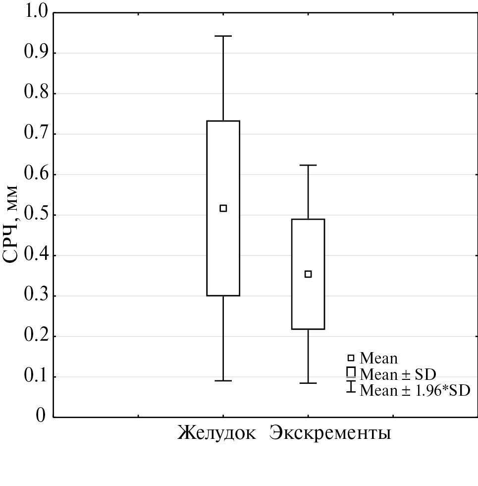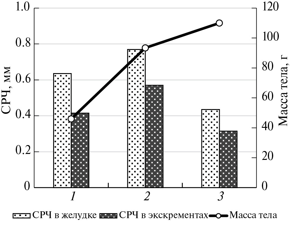 Таблица 2. СРЧ содержимого желудка и экскрементов у животных, отнесенных к разным весовым категориям (среднее ± SD, min–max)