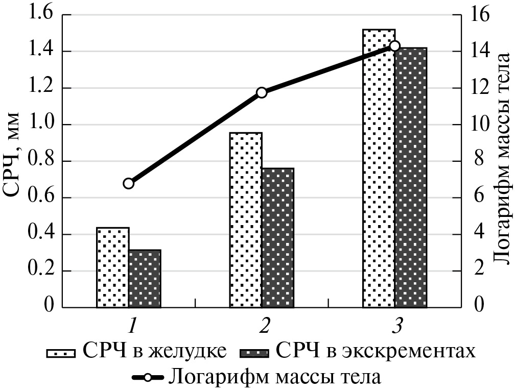 Рис. 6. Масса тела и СРЧ в содержимом желудка и экскрементах у специализированных копрофагов: 1 — пищухи, 2 — зайцы, 3 — бобры.