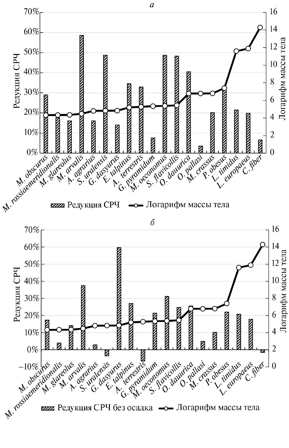 Рис. 7. Степень постгастричной редукции СРЧ у исследованных видов при разных вариантах расчета: с учетом всех размерных фракций (а) и без учета осадка (б).