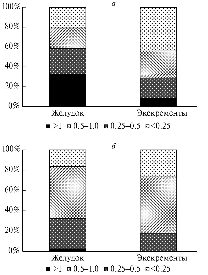 Рис. 9. Соотношение размерных фракций в содержимом желудка и экскрементах при потреблении дневной песчанкой разных кормов: а — Atriplex halimus, б — Salsola tetrandra.