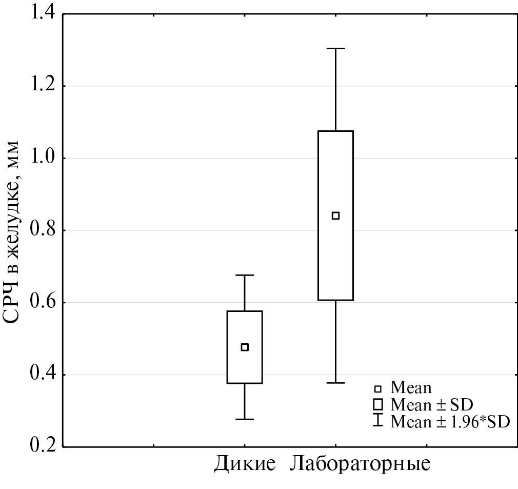 Рис. 10. Различие в результативности жевания (СРЧ содержимого желудка) между дикими и лабораторными грызунами.