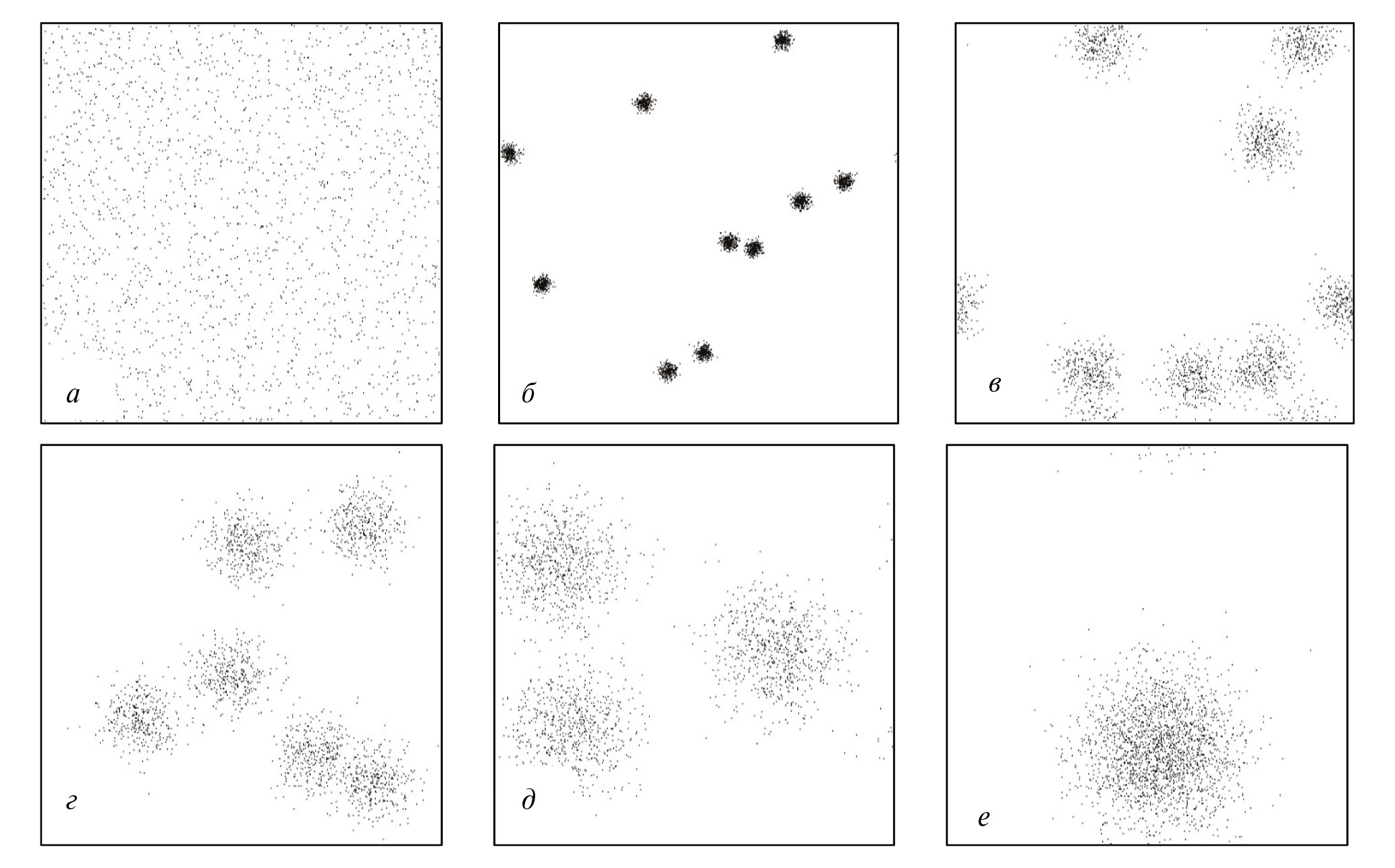 Рис. 2. Размещение корма: а – равномерное, б–е – агрегированное, с количеством центров 10, 8, 6, 3 и 1 соответственно.