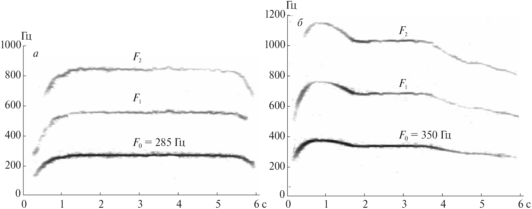 Рис. 1. Спектрограммы: а – человека (мужчины), протяжный крик “уууууу”, имитация воя взрослого волка; б – взрослого волка, одиночный вой. F0 – основная частота; F1, F2 – первая и вторая гармоники. Около F0 указано значение основной частоты в средней части крика. Спектр гармонический, гармоники кратны основной частоте.
