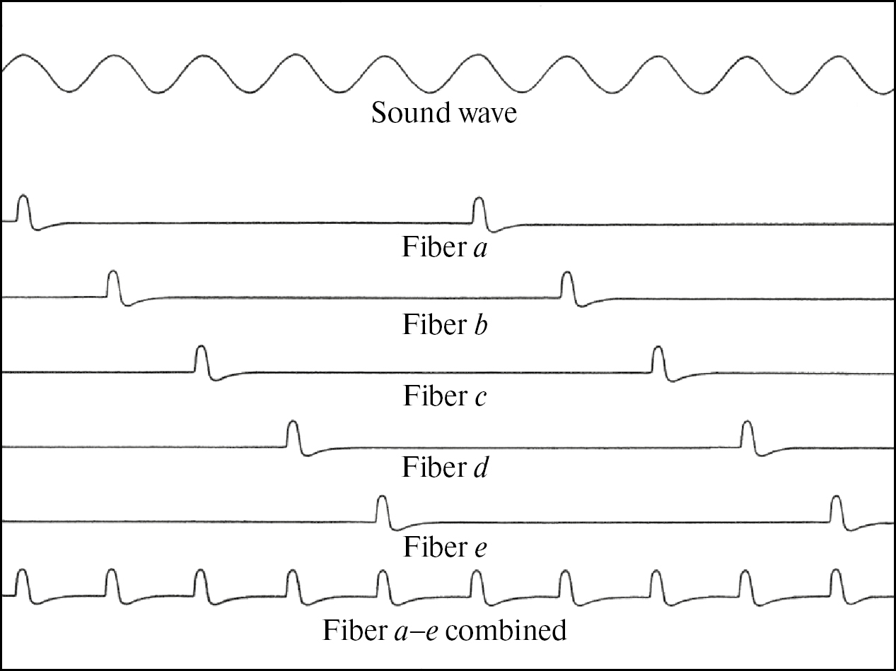 Вевер применительно к проведению колебаний высокой частоты слуховым нервом предположил, что активность каждого последующего волокна слухового нерва приходится на рефрактерную фазу предыдущего волокна. Суммарный отклик всех волокон соответствует частоте звукового стимула, и именно эта частота суммарного отклика передается по слуховому нерву в слуховой отдел мозга. “Залповый принцип” Вевера поясняет рис. 2, заимствованный из его работы (Wever, 1949).
