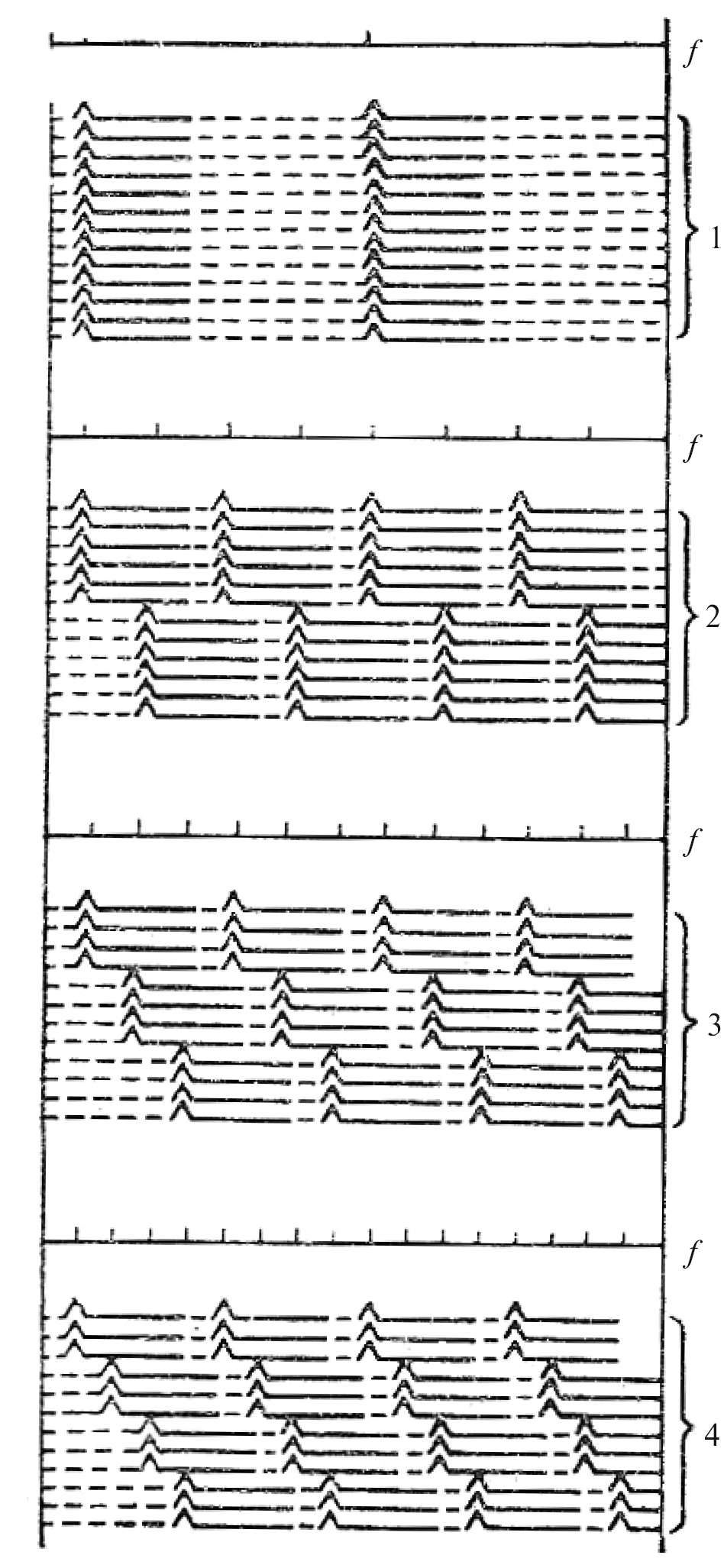 Рис. 3. Пример использования Юссоном “Залпового принципа” Вевера (Wever, 1949) для обоснования передачи голосовым связкам колебаний высокой частоты (Юссон, 1974, с. 65, рис. 19): “Схема четырех типов проводимости возвратного нерва. 1 – однофазный режим работы нерва. Частота электрических стимулов f = 200 Гц. Все волокна нерва возбуждаются одновременно. 2 – двухфазный режим, f = 800 Гц. Волокна нерва разделились на две части для поочередной передачи импульсов возбуждения. 3 и 4 – трех- и четырехфазные проводимости (f = 1200 и 1600 Гц). Соответственно, происходит разделение волокон нерва на три и четыре группы”.