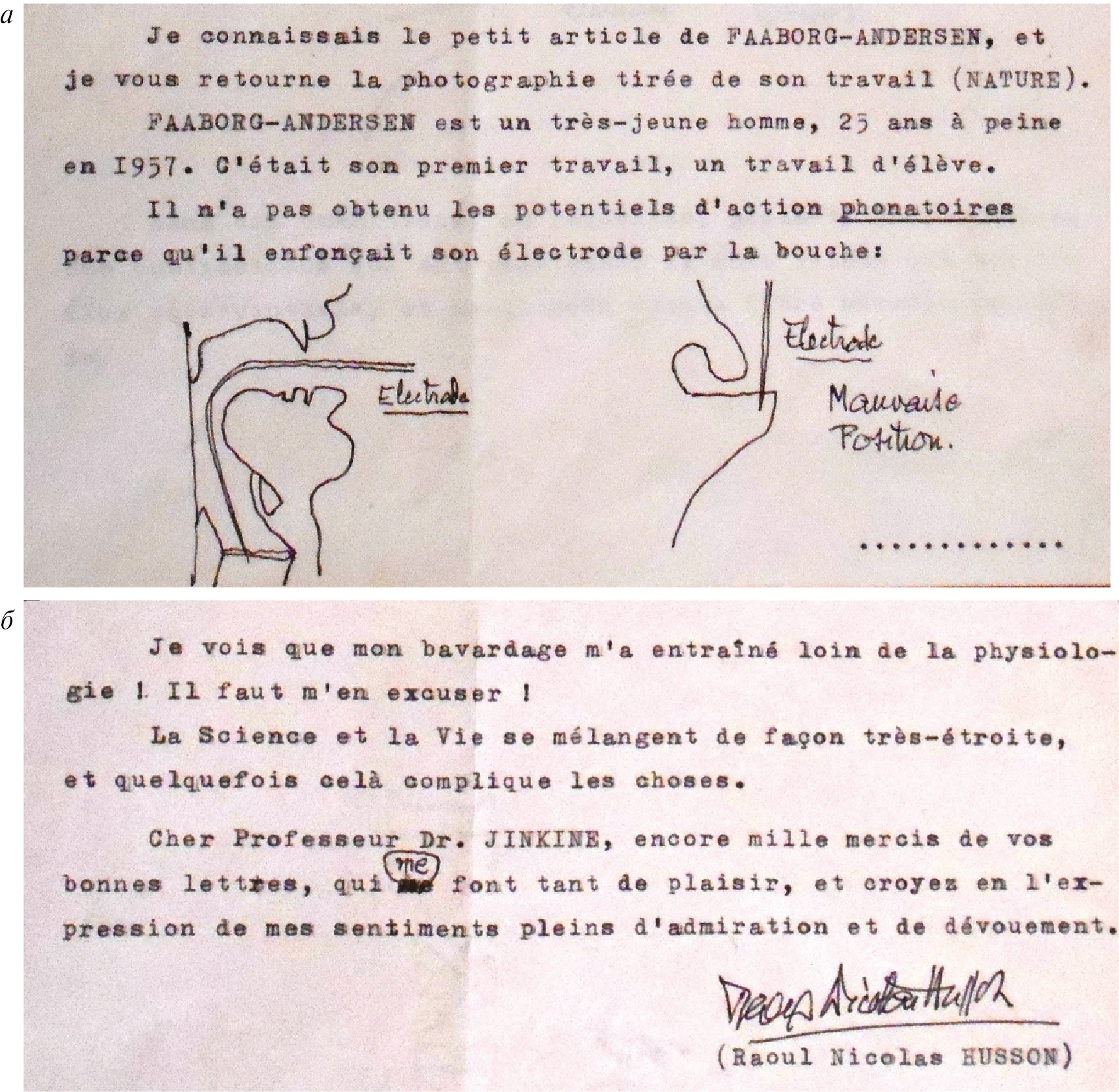 Среди советских ученых наибольший интерес нейрохронаксическая теория Юссона вызвала у известного психолога Николая Ивановича Жинкина (1893–1979). Н. И. Жинкин внес значительный вклад в изучение морфофизиологических механизмов речи и алгоритма организации речевого потока (Жинкин, 1958, 1960, 1963, 1965; Žinkin, 1963, 1968). Годы его творчества приходятся на время, когда нейрохронаксическая теория голосообразования активно обсуждалась в научном сообществе. Николай Иванович регулярно переписывался с Раулем Юссоном. 70 листов переписки московского психолога с парижским физиологом хранятся в Центральном государственном архиве города Москвы (ЦГА Москвы, Фонд NЛ. 52, Опись 1, Дело 249). Переписка носила как деловой, так и дружеский характер. В качестве примера привожу фрагменты большого (5 страниц) письма Р. Юссона Н. И. Жинкину (рис. 4).