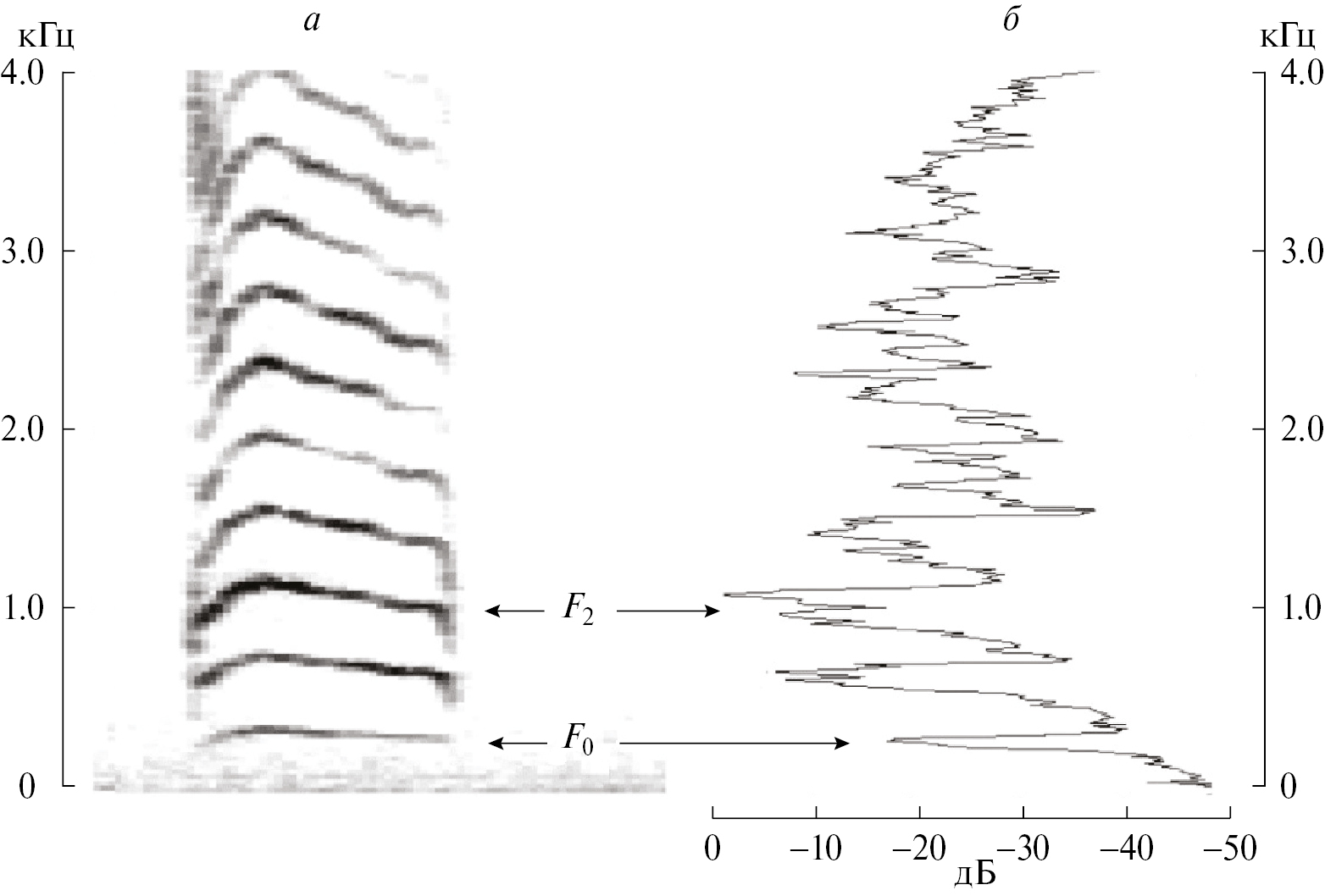 Рис. 5 поясняет, что происходит на выходе обсуждаемой Н. И. Жинкиным системы надгортанных фильтров. В качестве примера показана спектрограмма крика ягненка, который беспокойно бегает в стаде, с тревожным криком разыскивая мать. Характерная ситуация. По мере возрастания беспокойства ягнят их голоса воспринимаются на слух более высокими. Но, как показывает спектральный анализ, положение основной частоты в спектре крика не меняется, увеличивается амплитуда одной из гармоник, в данном случае – второй (F2). Доминирование амплитуды второй гармоники над амплитудой основной частоты существенно, около 20 дБ, а ее частота в 3 раза превышает частоту основного тона (рис. 5б).