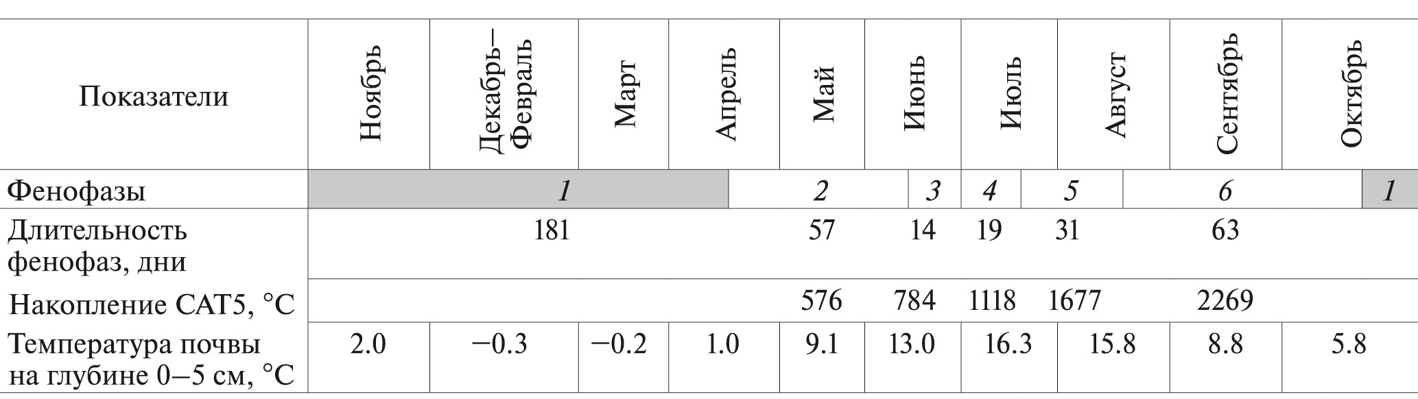 В осенне-зимний и частично весенний период (в среднем 181 ± 3 дня) температура поверхностного (0–5 см) слоя почвы составляла от –0.3 до 5.8°С. Появление всходов и начало отрастания растений H. mantegazzianum отмечали в середине апреля – начале мая после схода снежного покрова и прогрева поверхности почвы выше 5°С. Нередко листья проростков, ювенильных и имматурных растений H. mantegazzianum полностью закрывали поверхность почвы. Позже разворачивались розеточные листья виргинильных и генеративных особей. В середине июня генеративные особи бутонизировали, а в первой декаде июля приступали к цветению. Во второй декаде августа отмирали прикорневые и стеблевые листья генеративных особей, начиналось опадение семян нового урожая. В этот период накопленная сумма среднесуточных температур воздуха более 5°С (САТ5) составила в среднем 1677 ± 74°С. Продолжительность периода вегетации H. mantegazzianum была в среднем 185 ± 5 дней, а теплообеспеченность территории суммой активных температур составила 2269 ± 42°С (рис. 1).