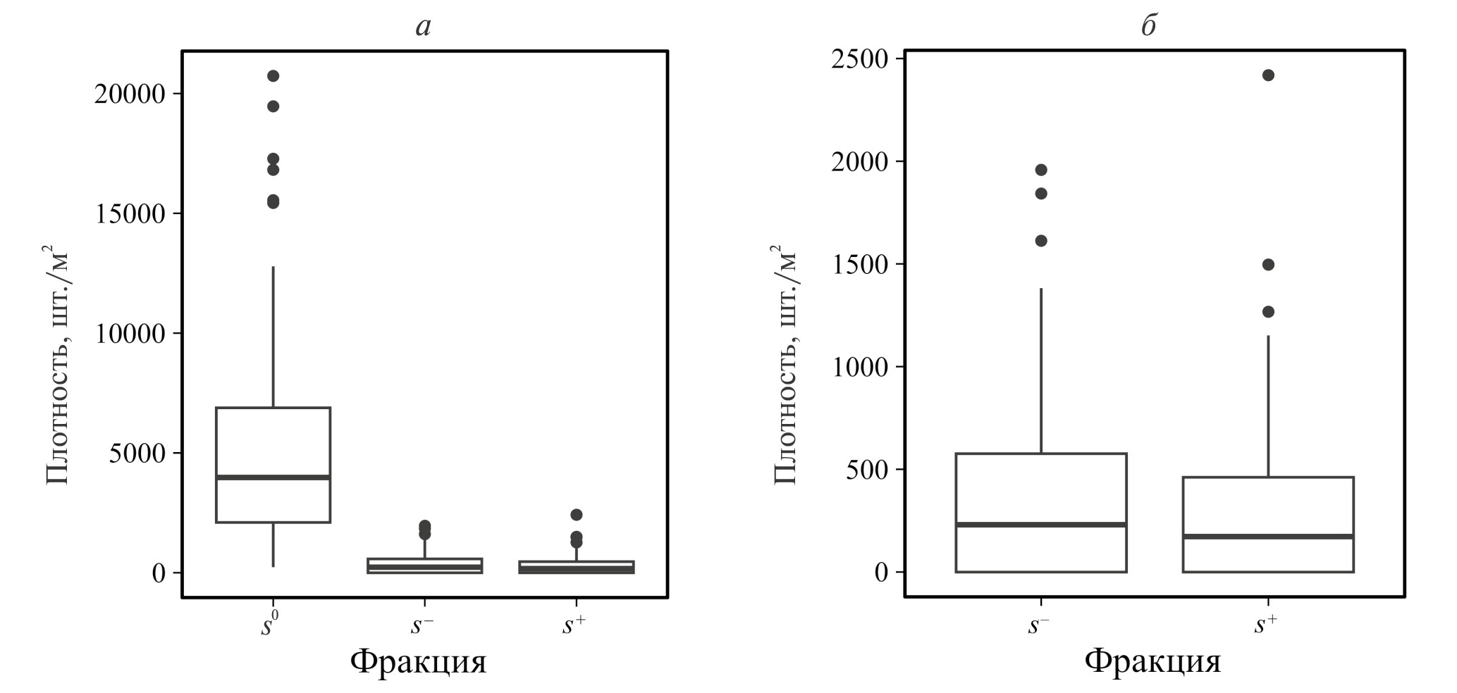 Рис. 3. Состав почвенного банка семян в ценопопуляциях H. mantegazzianum в осенний период: а – плотность пустых оболочек семян (se0) и семян, б – плотность мертвых (se–) и жизнеспособных (se+) семян. Представлены объединенные данные для всех ценопопуляций за 2021–2023 гг.
