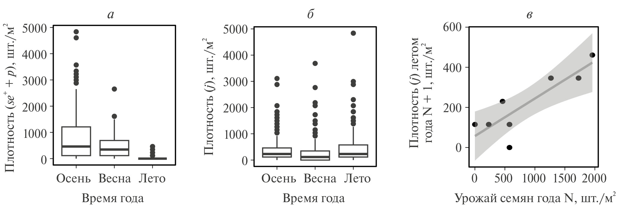 Рис. 4. Сезонные изменения численности семян, проростков и ювенильных растений H. mantegazzianum: а – плотность жизнеспособных семян и проростков, б – плотность ювенильных особей, в – взаимосвязь между урожаем семян и плотностью ювенильных растений в ходе вегетации следующего года (приведены медианные значения). Корреляция Пирсона r = 0.86, p = 0.0068; темно-серым фоном показан доверительный интервал 95%. Представлены объединенные данные для ЦП 1–4 за 2021–2023 гг.