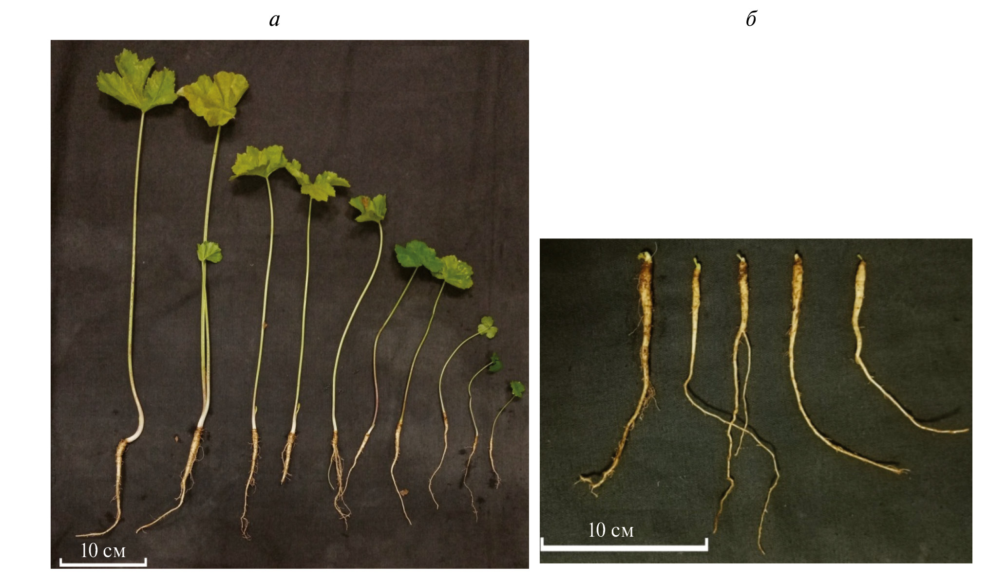 Рис. 5. Вариабельность габитуса и морфометрических параметров растений H. mantegazzianum первого года жизни: а – вегетирующие растения, б – растения в состоянии вынужденного покоя (август–сентябрь 2021 г.).