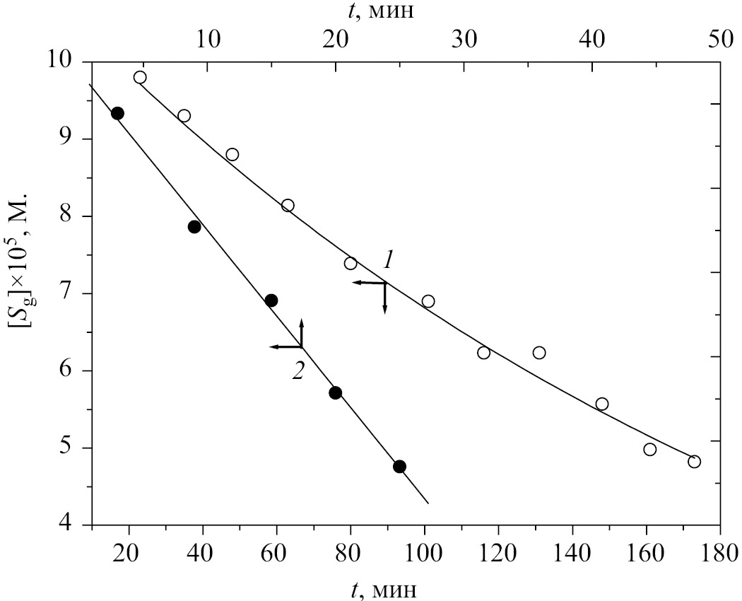 Рис. 1. Кинетические кривые окисления Et2S пероксоборатом натрия в растворах Н2О–MeСN при рН 8.48 (1), 11.05 (2). [ПБ] = 0.002 М., [СH3CN] = 1 об%, N0S/Vg = 1.08·10–4 M., 25°С