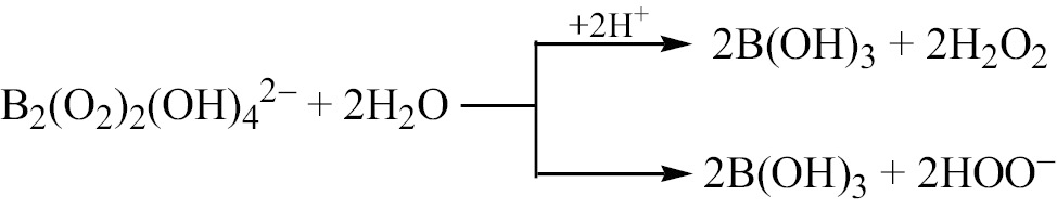 Натриевая соль пероксобората Na2[В2(О2)2(ОН)4]× 6H2O будучи дешевым, нетоксичным, стабильным и простым в использовании соединением, производимым в промышленных масштабах, способна успешно заменять Н2О2 в окислительных реакциях. В водных растворах анион пероксобората распадается с образованием Н2О2 и борной кислоты [8].