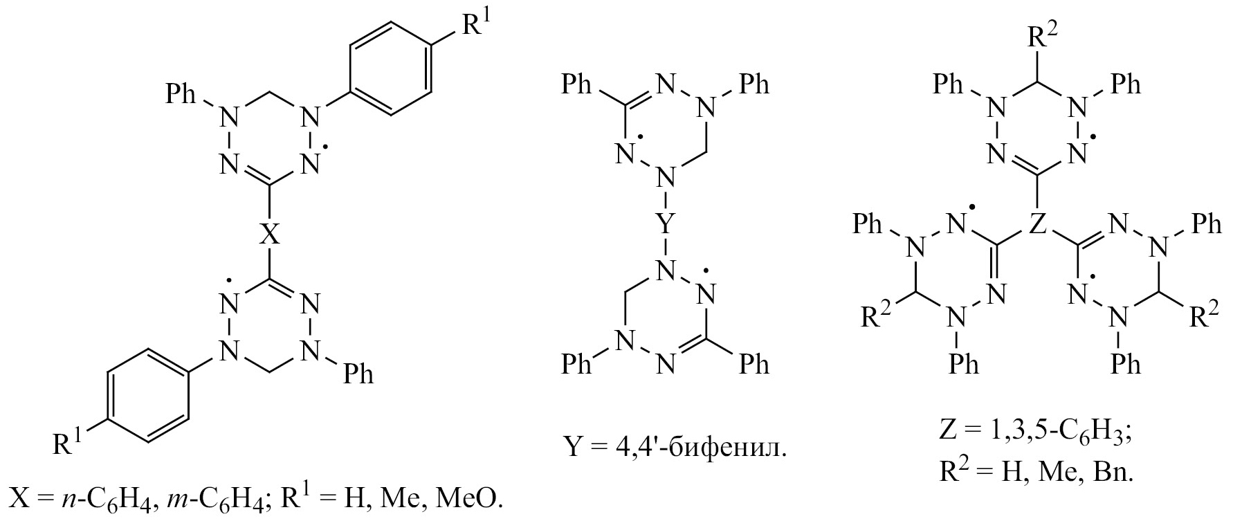Стабильные π-радикалы с делокализованным спином, обладающие парамагнитными свойствами, являются важными строительными блоками в производстве высокотехнологичных функциональных материалов для технологических и биологических применений [1]. Тетразинильные радикалы (вердазилы), впервые описанные в 1964 г. Куном и Тришманом [2], до сих пор остаются объектами пристального внимания исследователей. Тетразинилы интересны благодаря высокой химической стабильности, структурному разнообразию и магнитным свойствам [3, 4]. Они выступают в качестве лигандов при получении координационных соединений с различными металлами [5, 6]. Растущий спрос на применение тетразинильных радикалов привел к появлению в последнее время работ по синтезу мультиспиновых систем, в частности, вердазил-нитронилнитроксидных дирадикалов [7, 8].