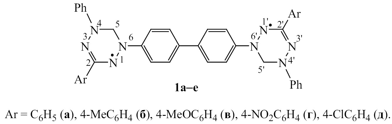 В качестве объектов исследования была выбрана серия тетразинильных бирадикалов 1а–д, различающихся заместителями в пара-положениях фенильных фрагментов у атома N2 3,4-дигидро-1,2,4,5-тетразинильного цикла (схема 2).