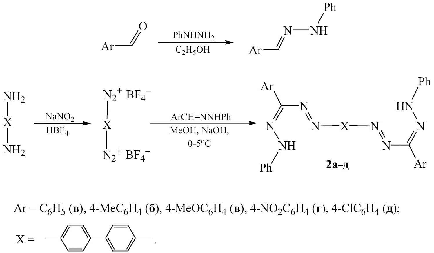 1,1′-([1,1′-Бифенил]-4,4′-диил)бис(5-фенил-3-(арил)формазаны) 2a–д получали по методике, аналогичной приведенной в работе [19]. Температуры плавления и спектральные характеристики совпадают с литературными данными.